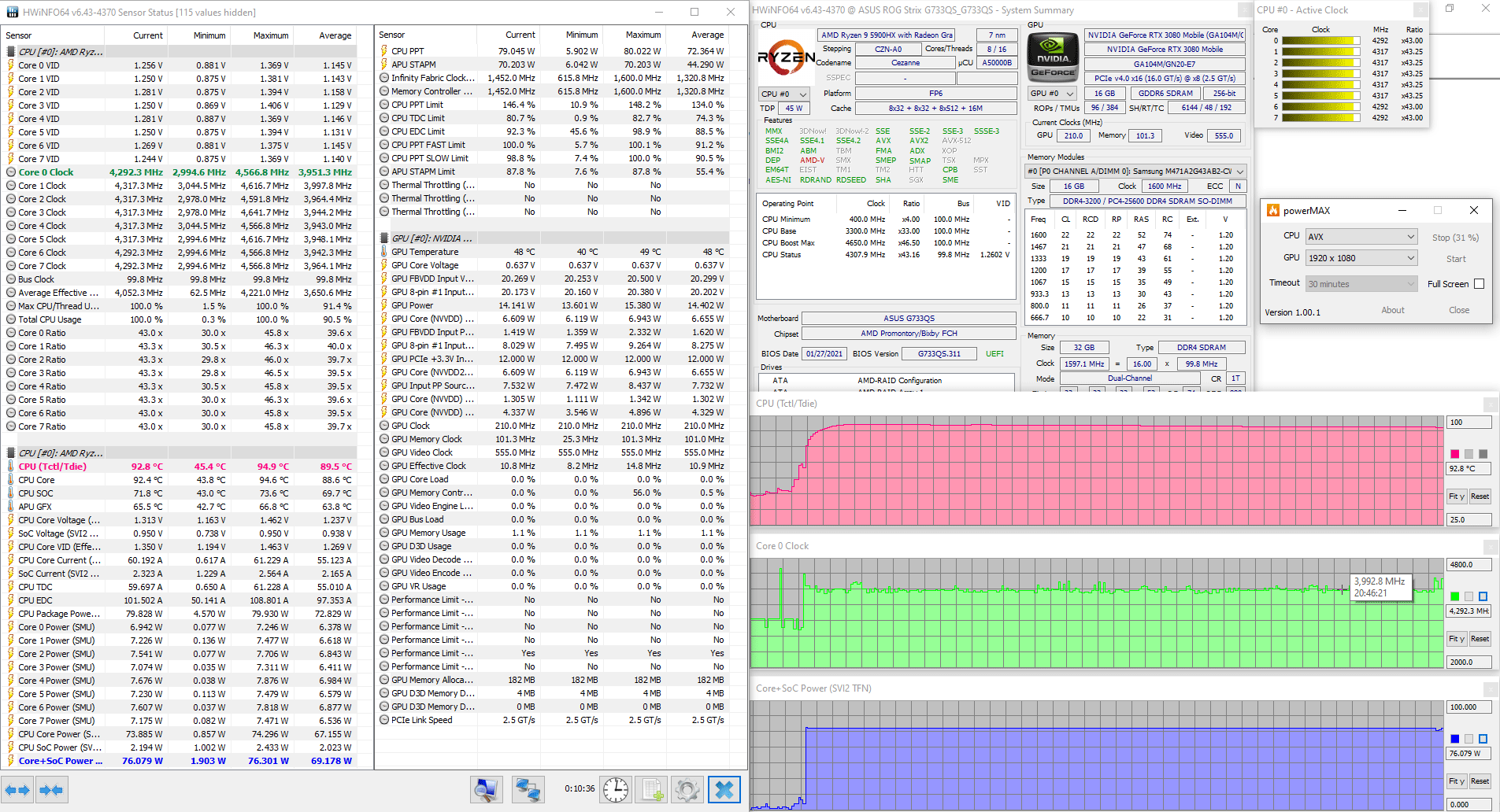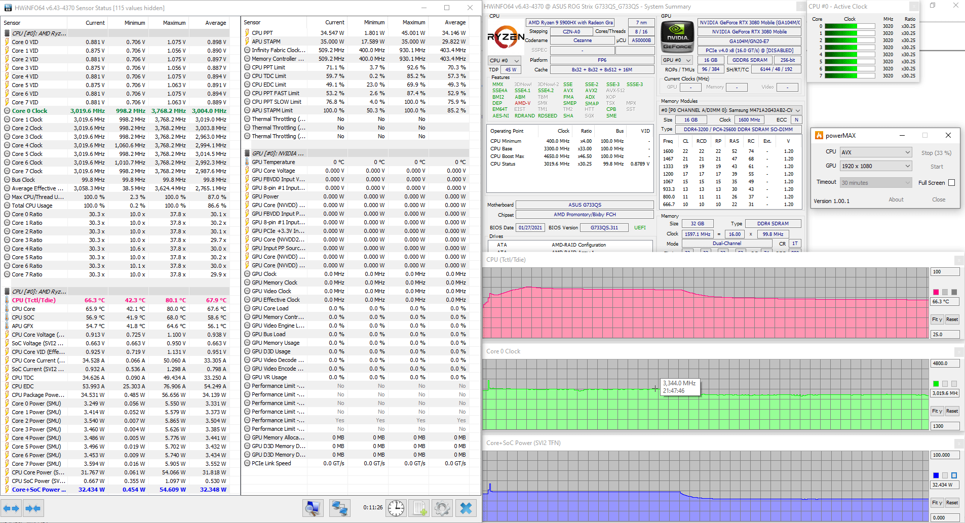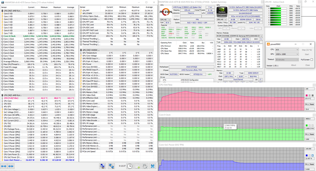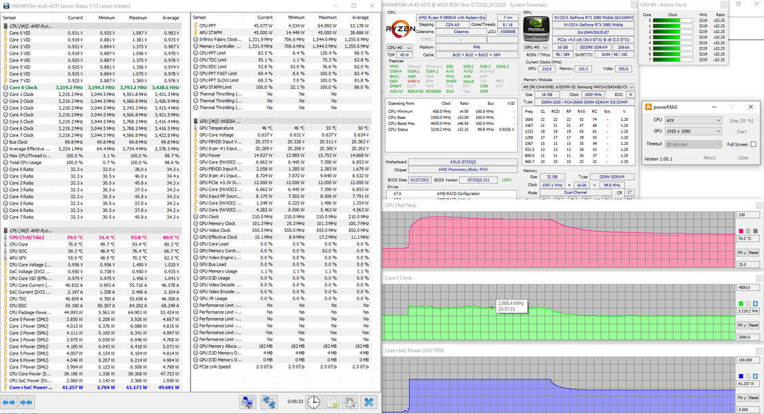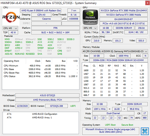 | Видеоподсистема | интегрированная графика AMD Radeon Graphics; Nvidia GeForce RTX 3080 Laptop 16 ГБ до 1645 МГц (ROG Boost — 115 Вт, Dynamic Boost — 130 Вт) | |