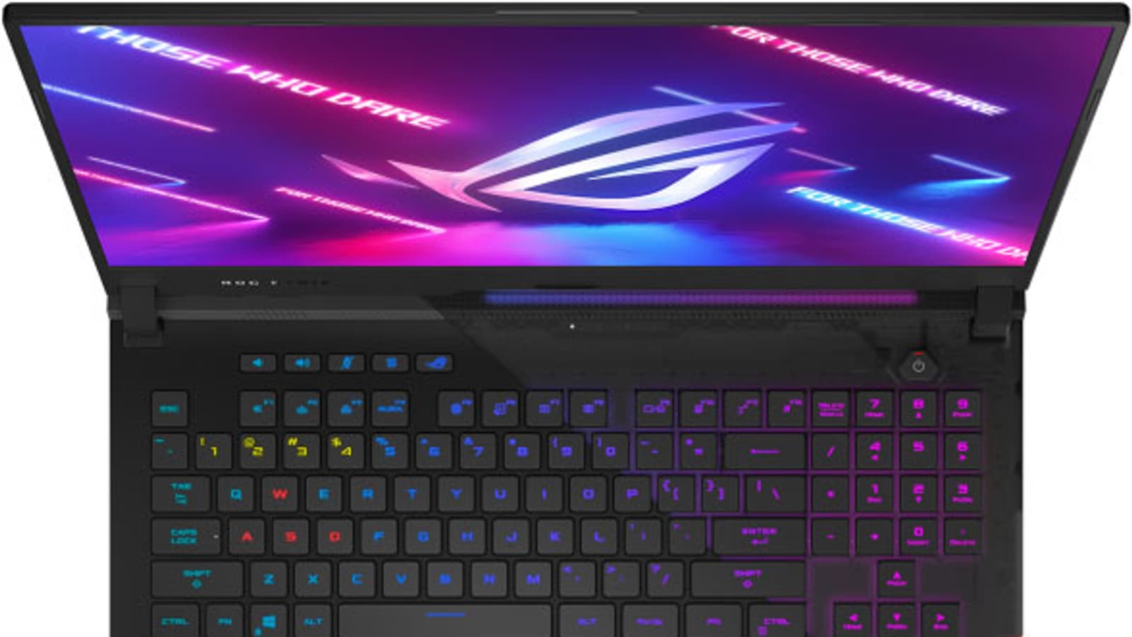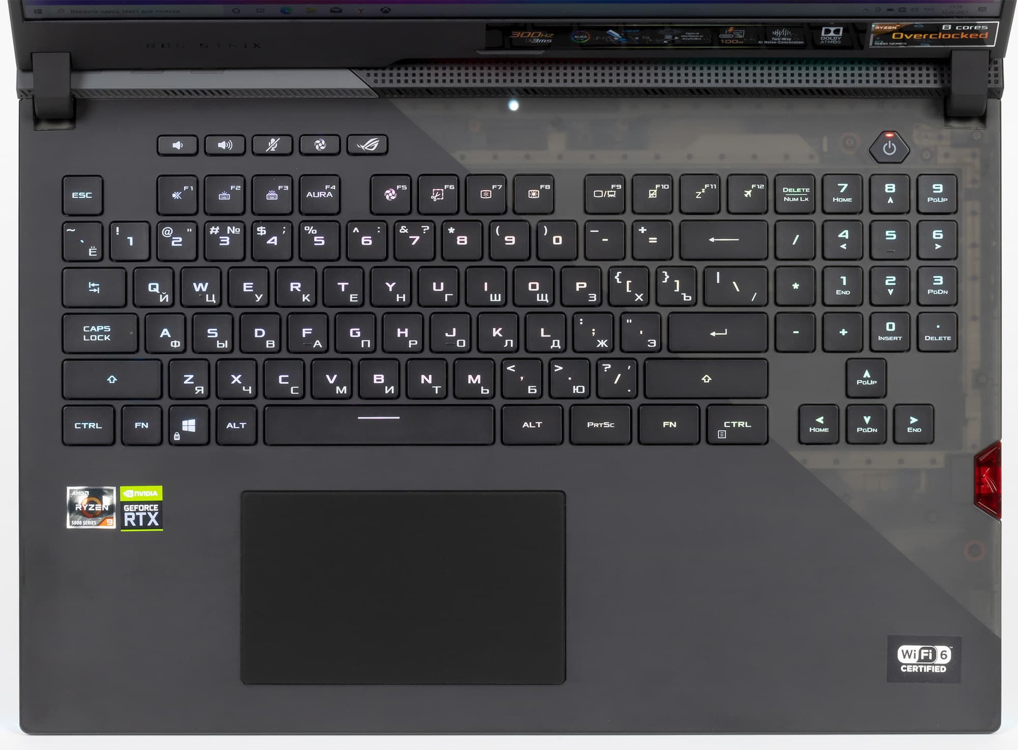 Asus ROG Strix Scar 17 G733 оснащен полноразмерной клавиатурой с выделенным блоком стрелок и блоком цифровых клавиш. Размеры большинства клавиш, включая функциональные и стрелки, составляют 15×15 мм, оба Shift и Enter увеличены в размерах, а сверху размещены пять индивидуальных клавиш, отвечающих за изменение громкости, отключение/включение микрофона, режим работы вентиляторов системы охлаждения и запуск Asus ROG Armoury Crate.