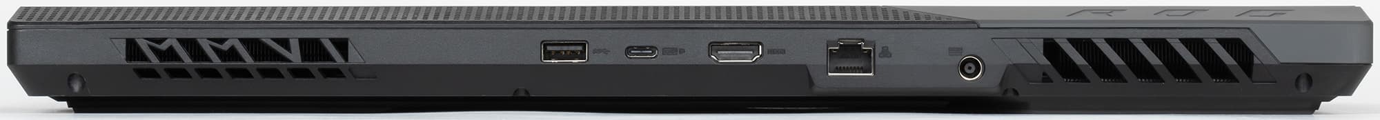 На задний торец выведены две вентиляционные решетки и интерфейсные разъемы, среди которых USB 3.2 Gen1 Type-A, USB 3.2 Gen2 Type-C, HDMI 2.0b, RJ-45 и разъем питания.