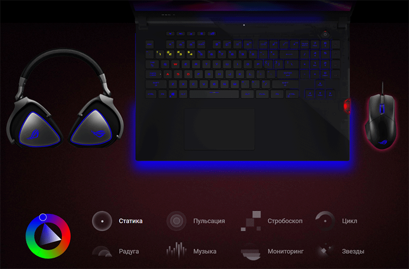Для ее настройки в Asus ROG Armoury Crate предусмотрен соответствующий раздел с 12 предустановленными эффектами.