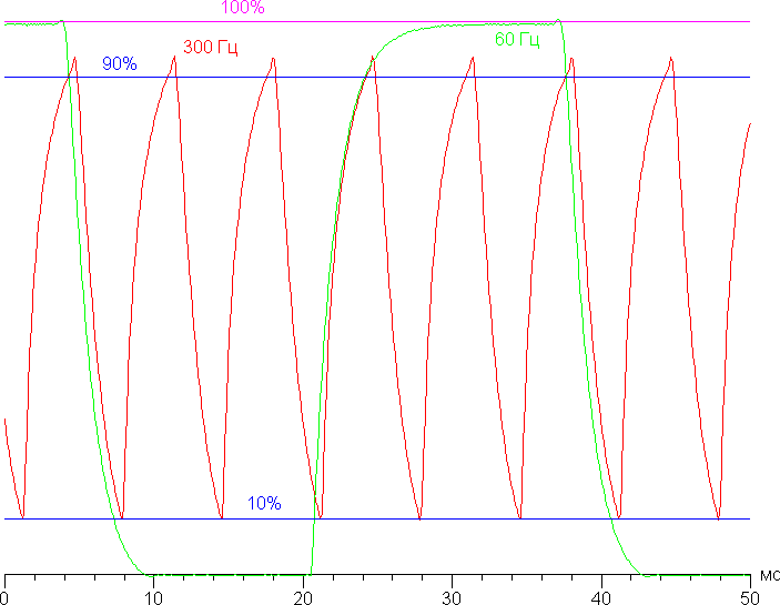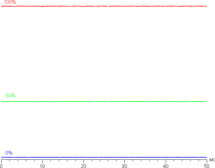 На любом уровне яркости значимая модуляция подсветки отсутствует, поэтому нет и никакого мерцания экрана. В доказательство приведем графики зависимости яркости (вертикальная ось) от времени (горизонтальная ось) при различных значениях настройки яркости: