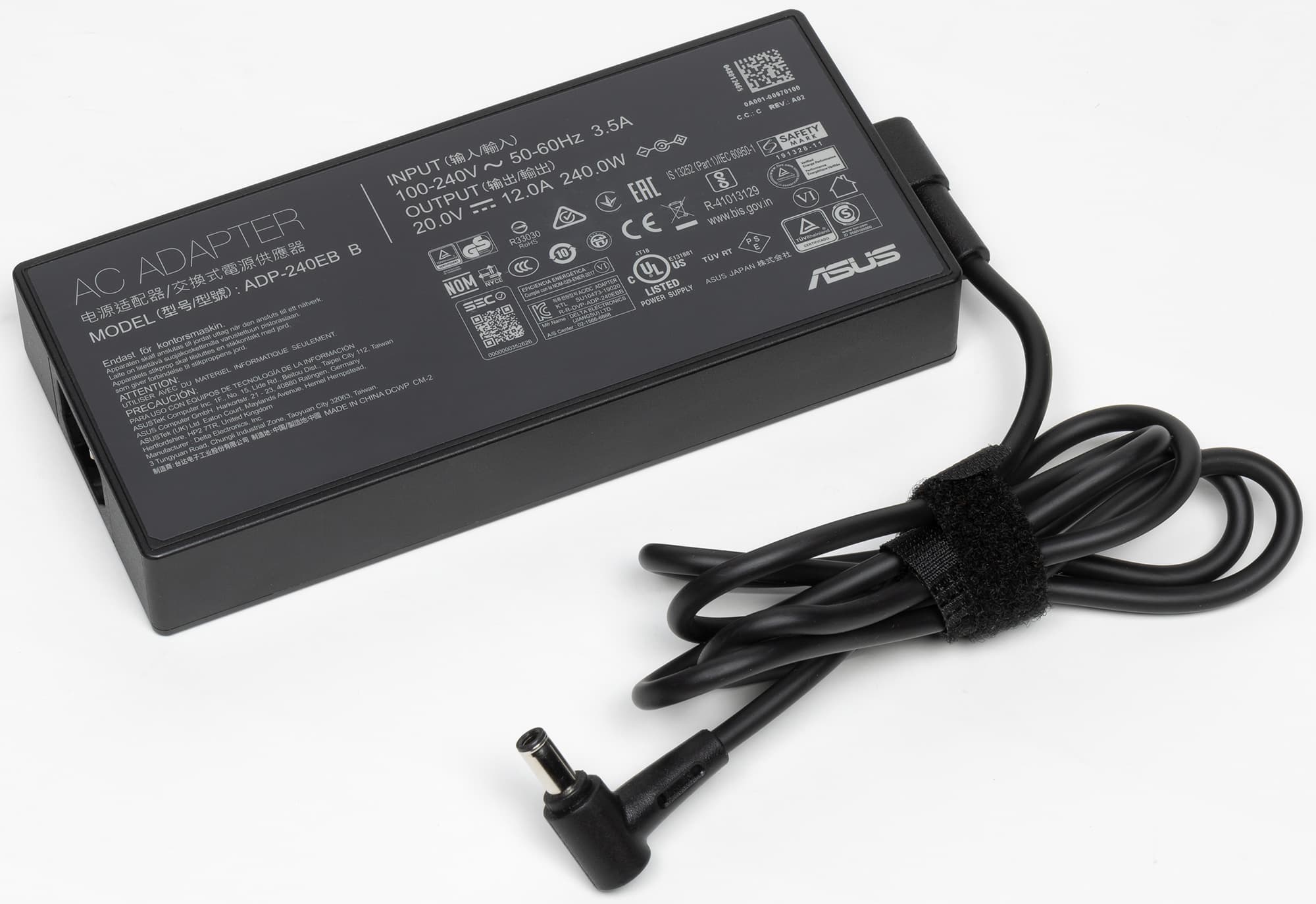 Asus ROG Strix Scar 17 G733 комплектуется адаптером питания ADP-240EB мощностью 240 Вт (20 В, 12,0 А) массой 730 граммов и встроенным кабелем длиной 1,28 м.