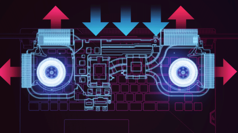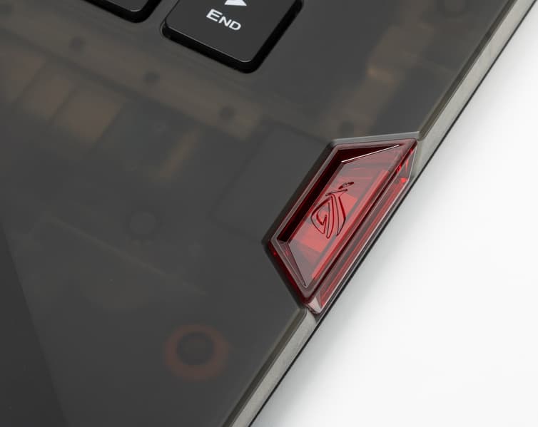 Игровой статус ноутбука подчеркивает и сияющий металлом логотип ROG на верхней крышке, соседствующий с декором из иллюминационной перфорации, плавно переходящей с нижней части корпуса.