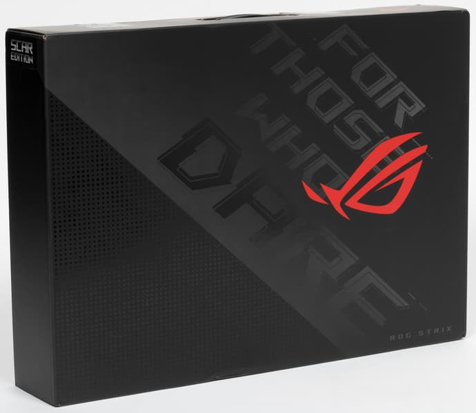 Ноутбук Asus ROG Strix Scar 17 G733 поставляется в большой картонной коробке с алым логотипом серии ROG на лицевой стороне и пластиковой ручкой для переноски.