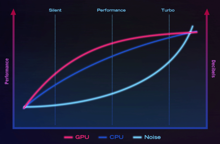 Если ноутбук не нагружать совсем, то его система охлаждения все равно работает в активном режиме, и это слышно. В случае большой нагрузки на процессор и на видеокарту шум от системы охлаждения в случае профиля Turbo очень высокий, а в случае Silent — невысокий, но при этом существенно снижается производительность. В основном характер шума ровный и не раздражает, и только на уровне выше 40 дБА появляется неприятная низкочастотная составляющая.