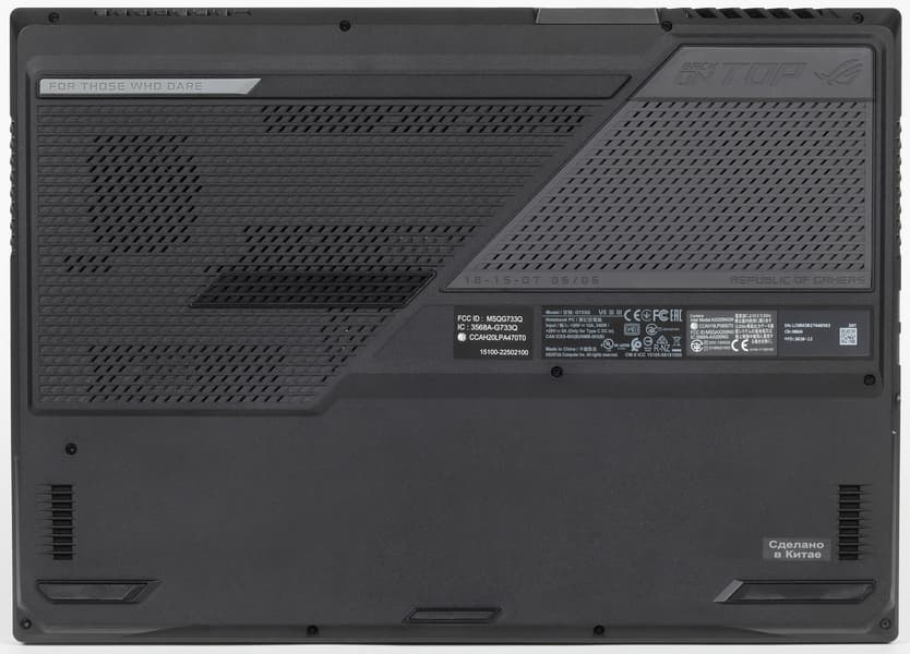 Если рабочая панель и крышка выполнены из металла, то основание у Asus ROG Strix Scar 17 G733 пластиковое. На нем выделяются две массивные вентиляционные решетки и резиновые ножки по периметру, на которые ноутбук надежно опирается.