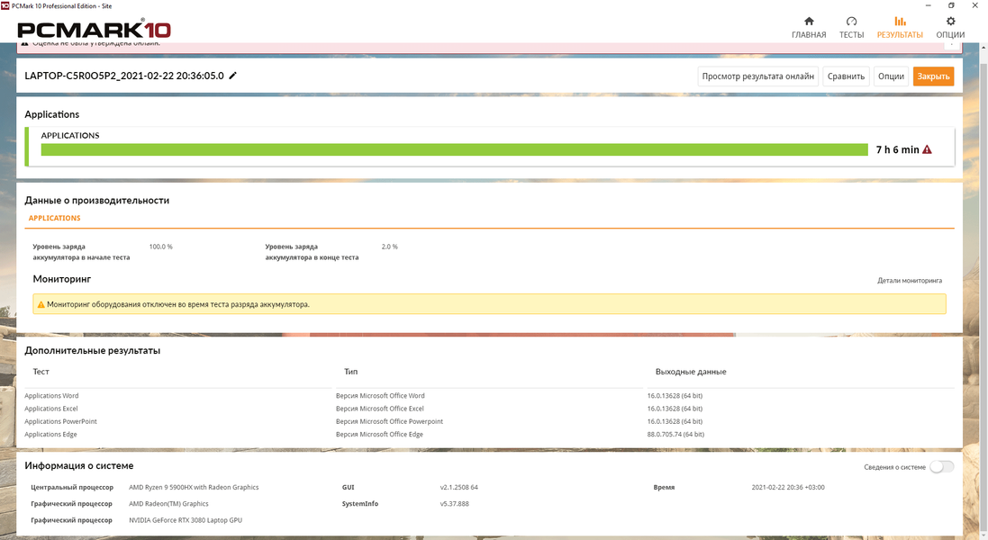 При эмуляции игровой нагрузки заряда аккумулятора хватило только на один час с четвертью, а если за ноутбуком работать в Word, Excel, PowerPoint и Microsoft Edge, то аккумулятора хватит на семь с небольшим часов.