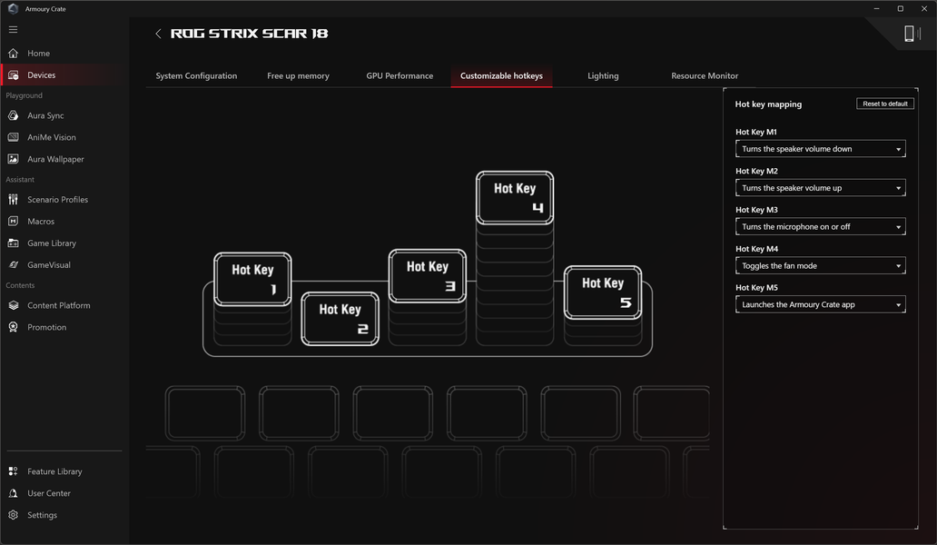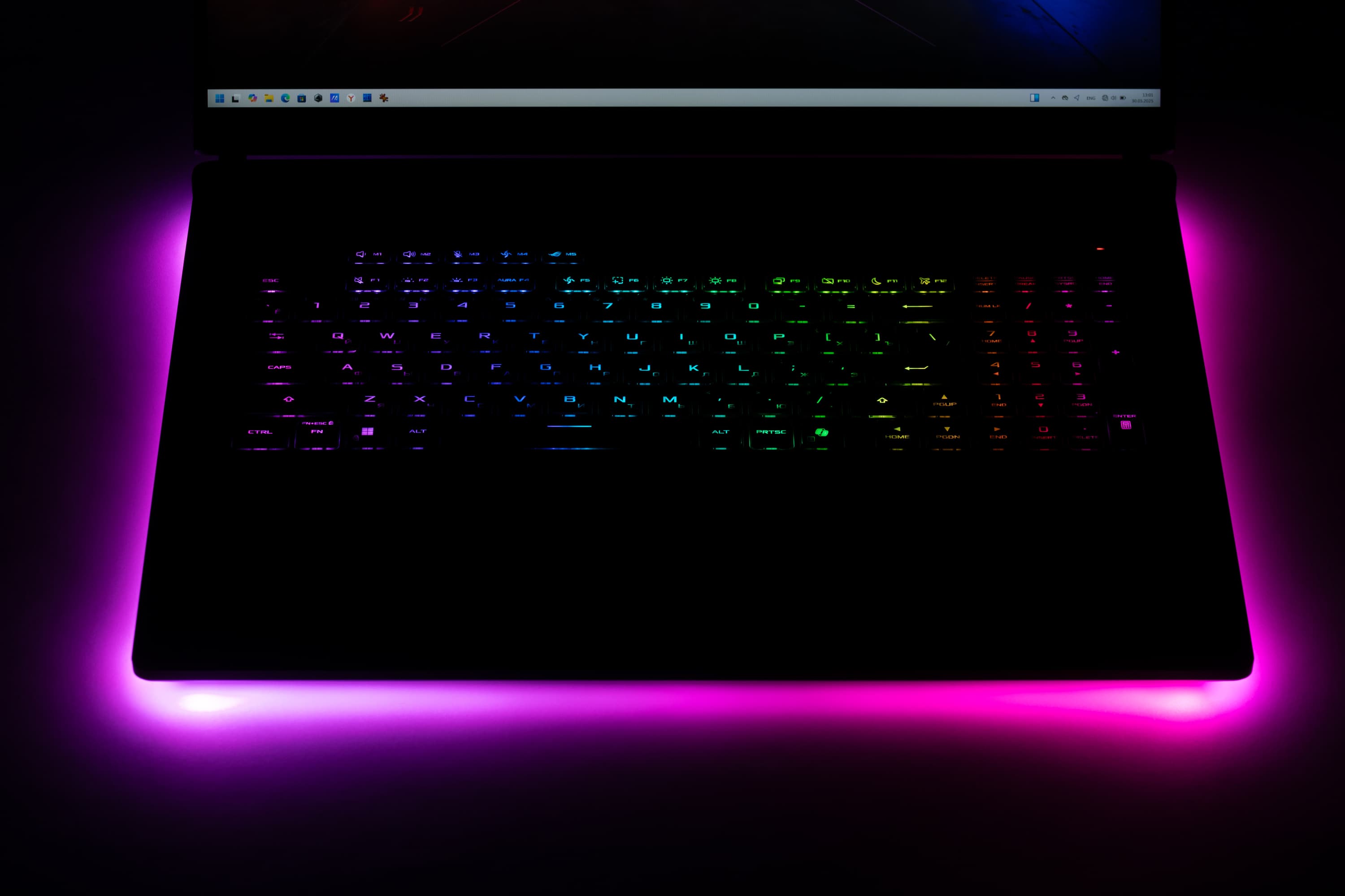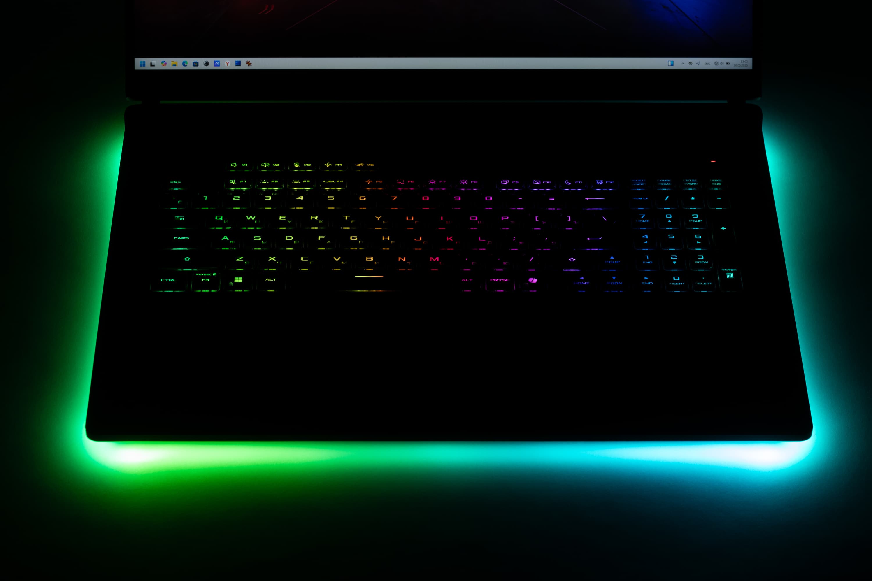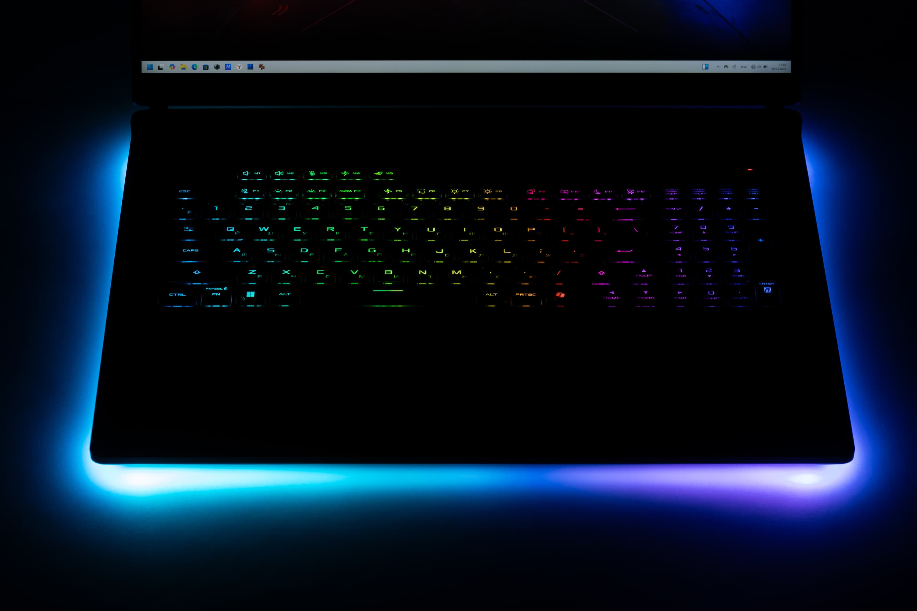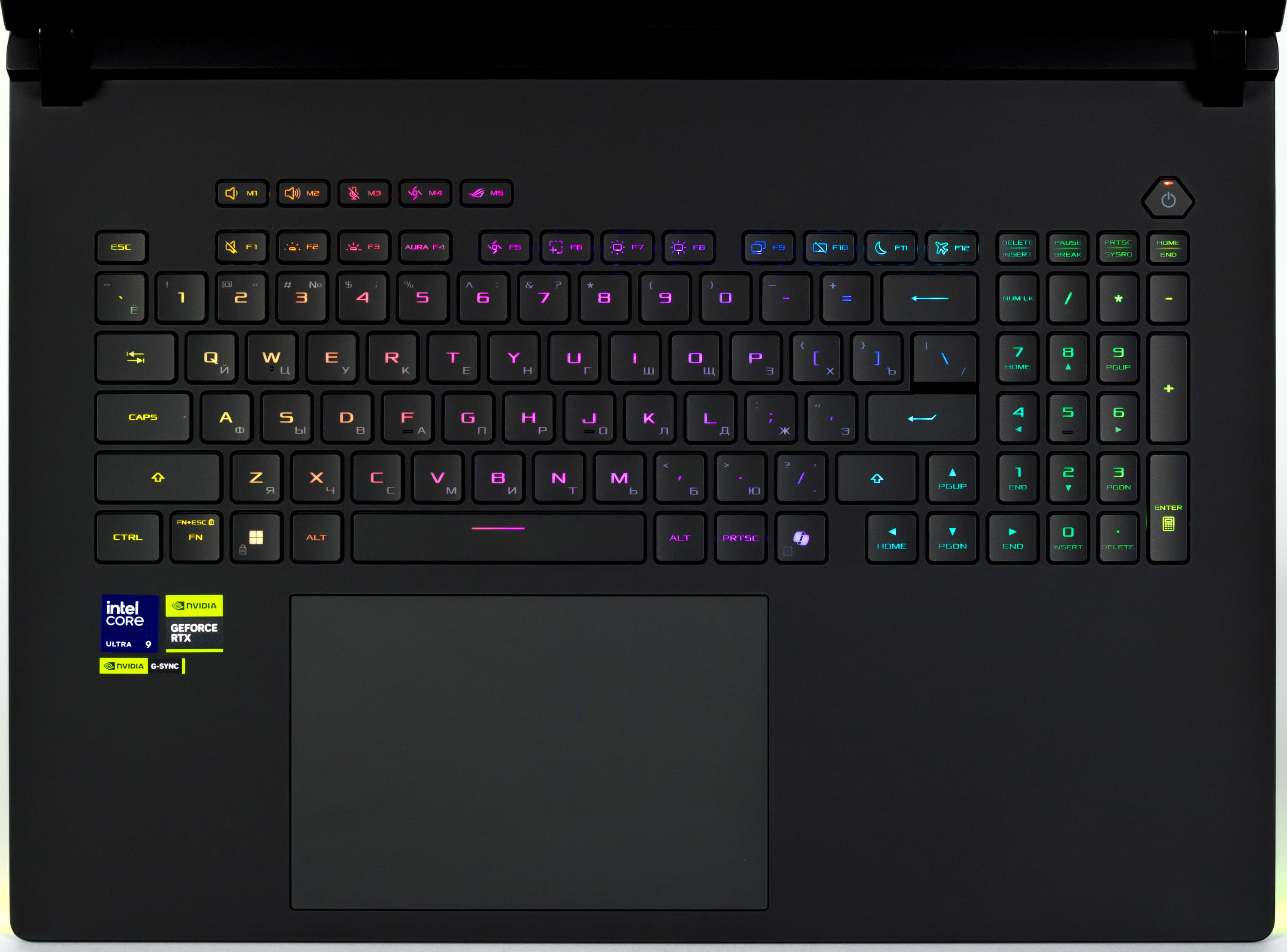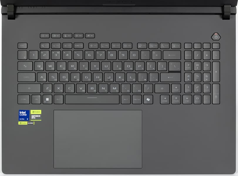 Пользователю предлагается полноразмерная клавиатура мембранного типа, по раскладке и функциональности почти не уступающая стандартной десктопной конфигурации. Она содержит полноценный цифровой блок из 18 клавиш (уменьшенных по ширине по отношению к основным) и полноразмерные «стрелки». В самом верхнем ряду, смещенном справа, находятся клавиши управления громкостью, отключения микрофона, максимального ускорения вентиляторов и вызова фирменной утилиты Armour Crate.