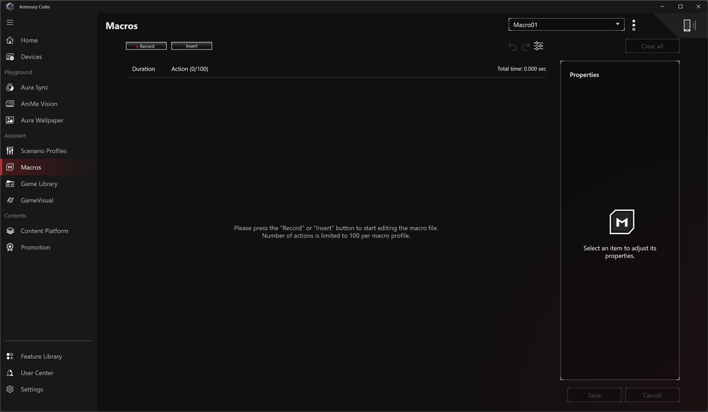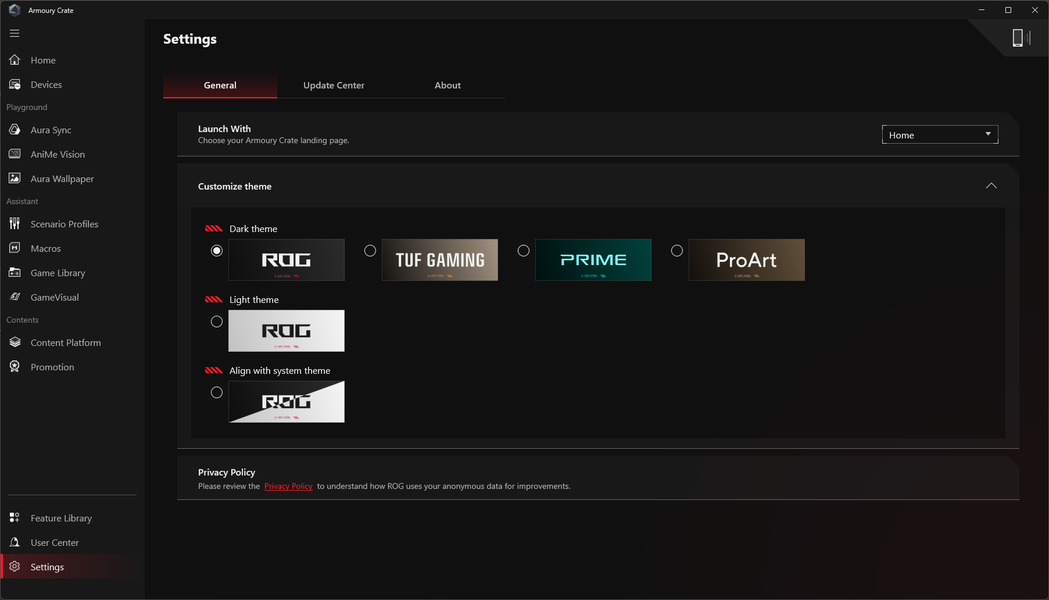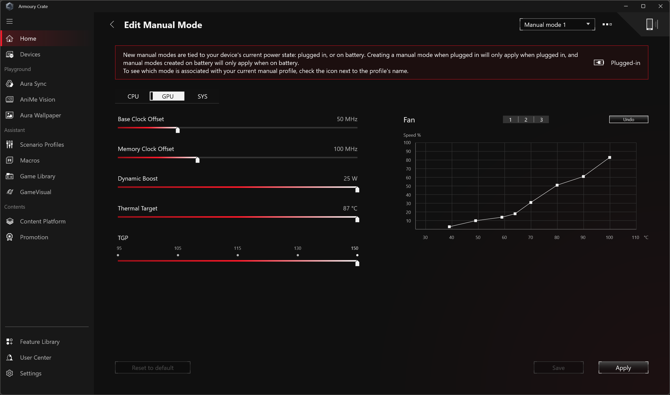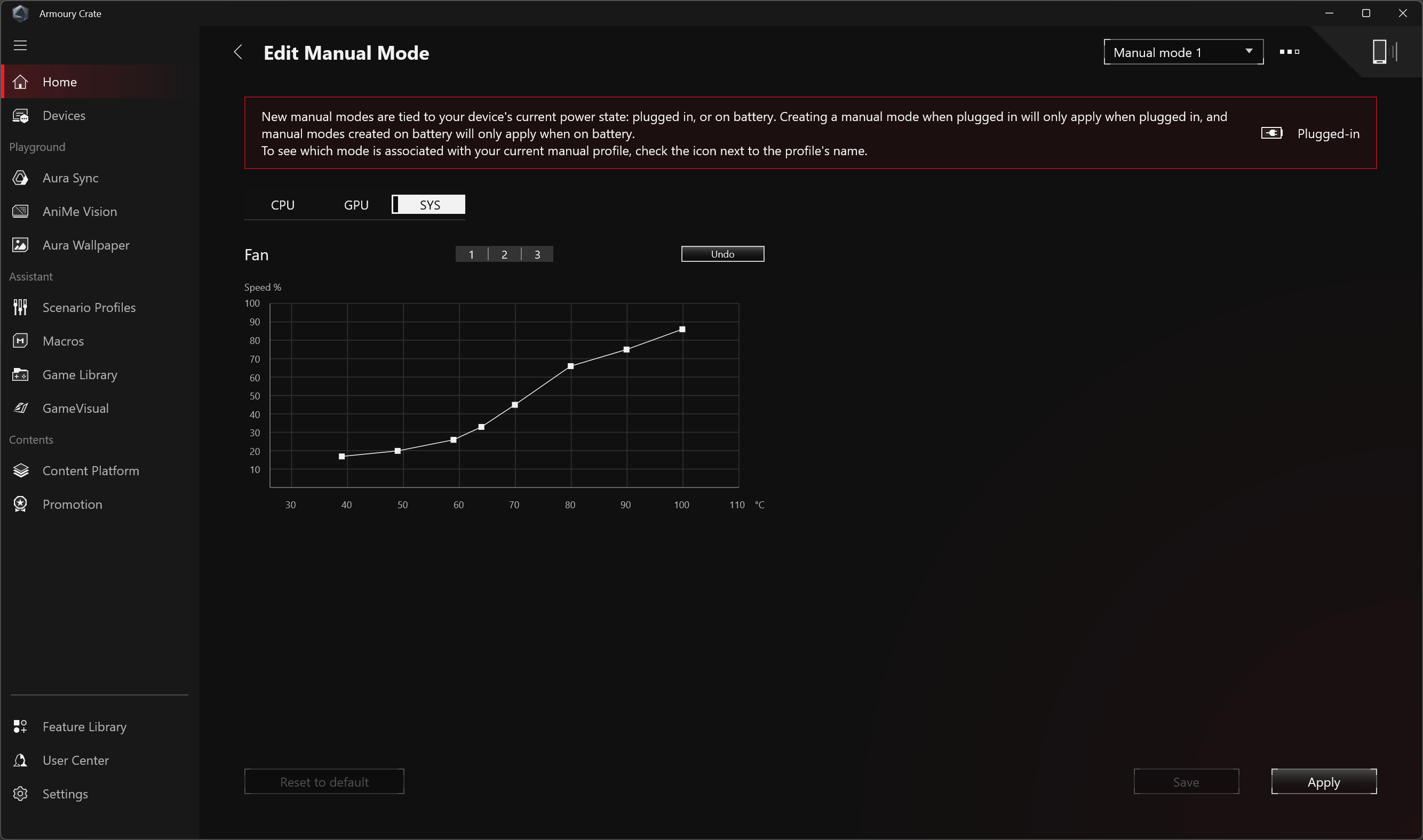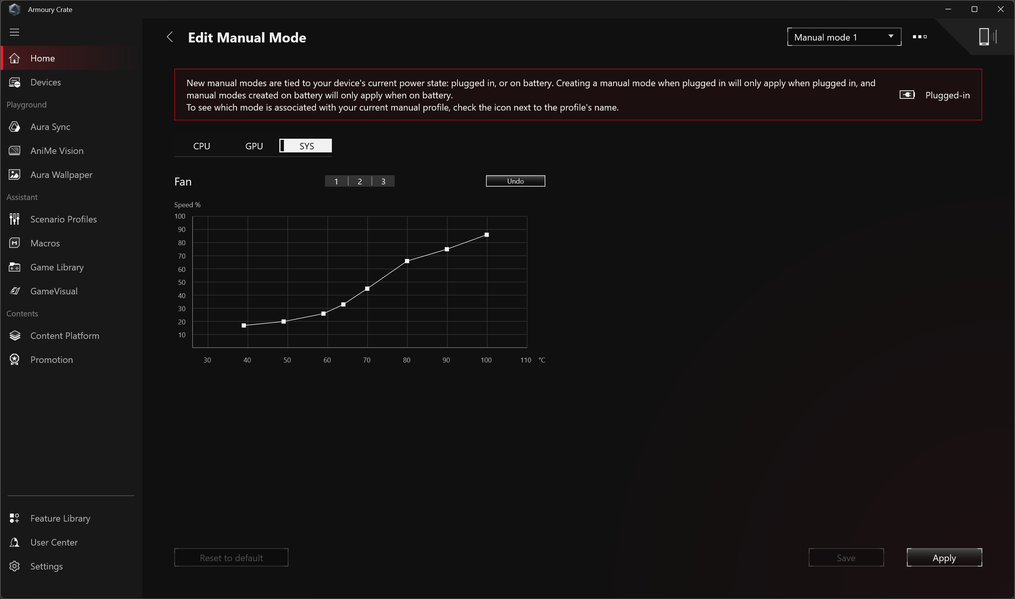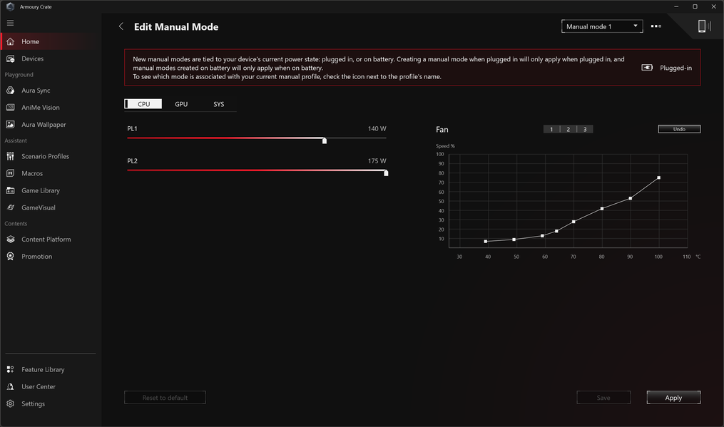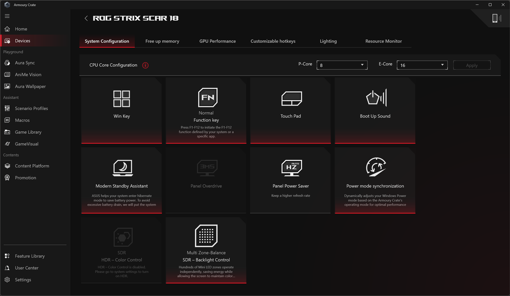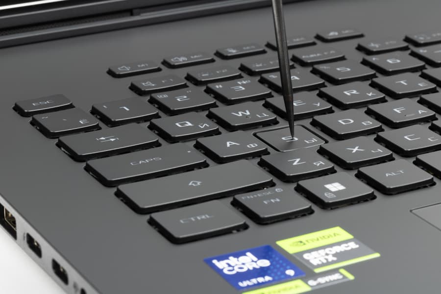 Пользователю предлагается полноразмерная клавиатура мембранного типа, по раскладке и функциональности почти не уступающая стандартной десктопной конфигурации. Она содержит полноценный цифровой блок из 18 клавиш (уменьшенных по ширине по отношению к основным) и полноразмерные «стрелки». В самом верхнем ряду, смещенном справа, находятся клавиши управления громкостью, отключения микрофона, максимального ускорения вентиляторов и вызова фирменной утилиты Armour Crate.
