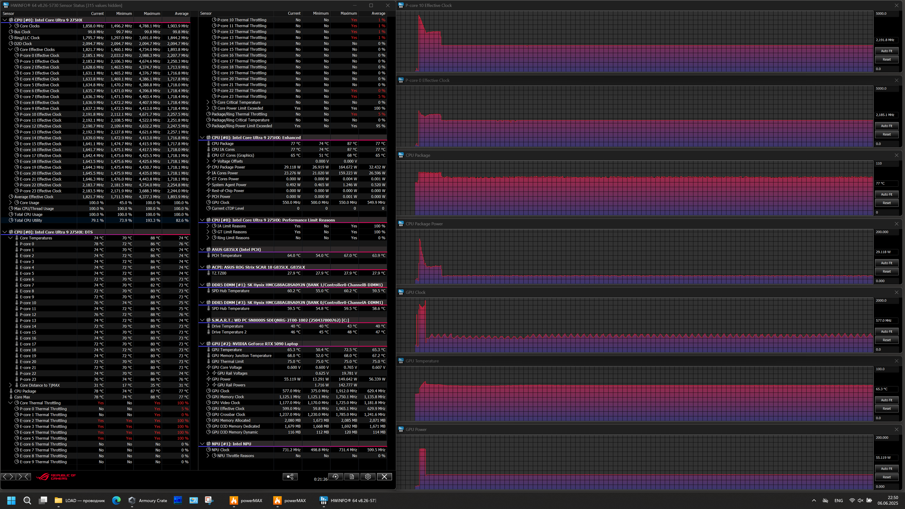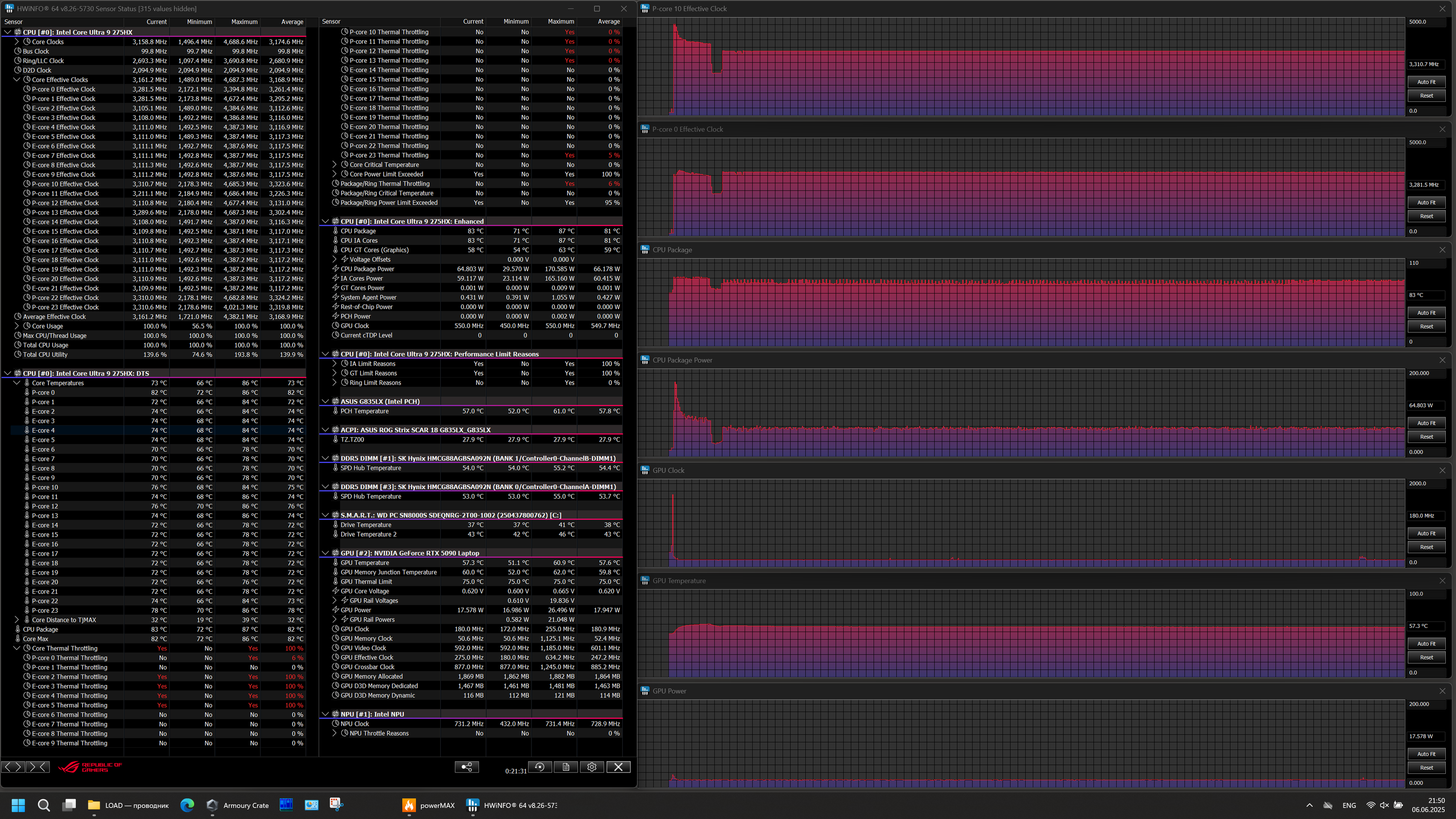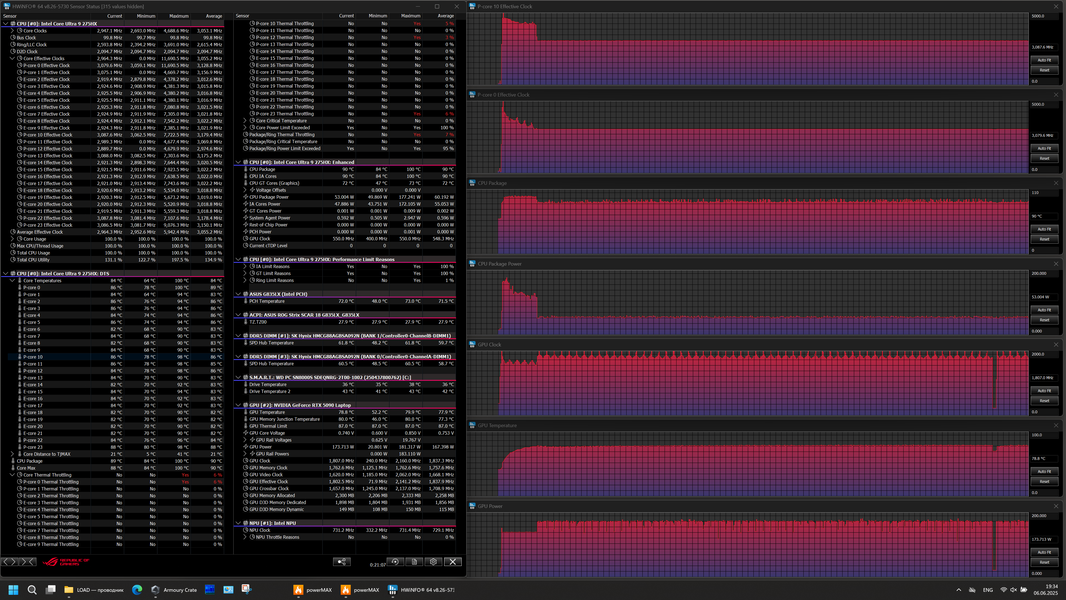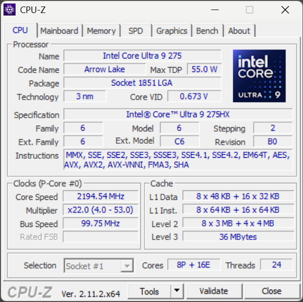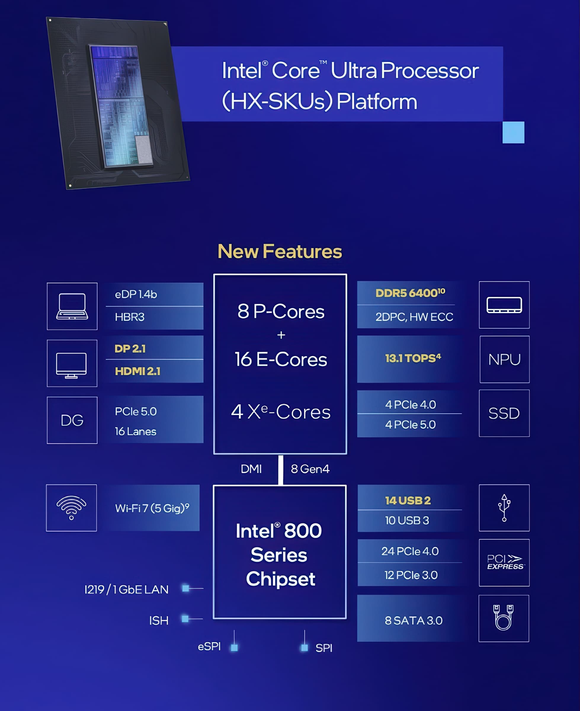 | Процессор | Intel Core Ultra 9 275HX: 8 P-ядер/8 потоков, 2,7 ГГц (Turbo 5,4 ГГц), 16 E-ядер/16 потоков; 2,1 ГГц (Turbo 4,6 ГГц); TDP 45—55 Вт (Turbo 160 Вт), Tjmax — 105 °C | |