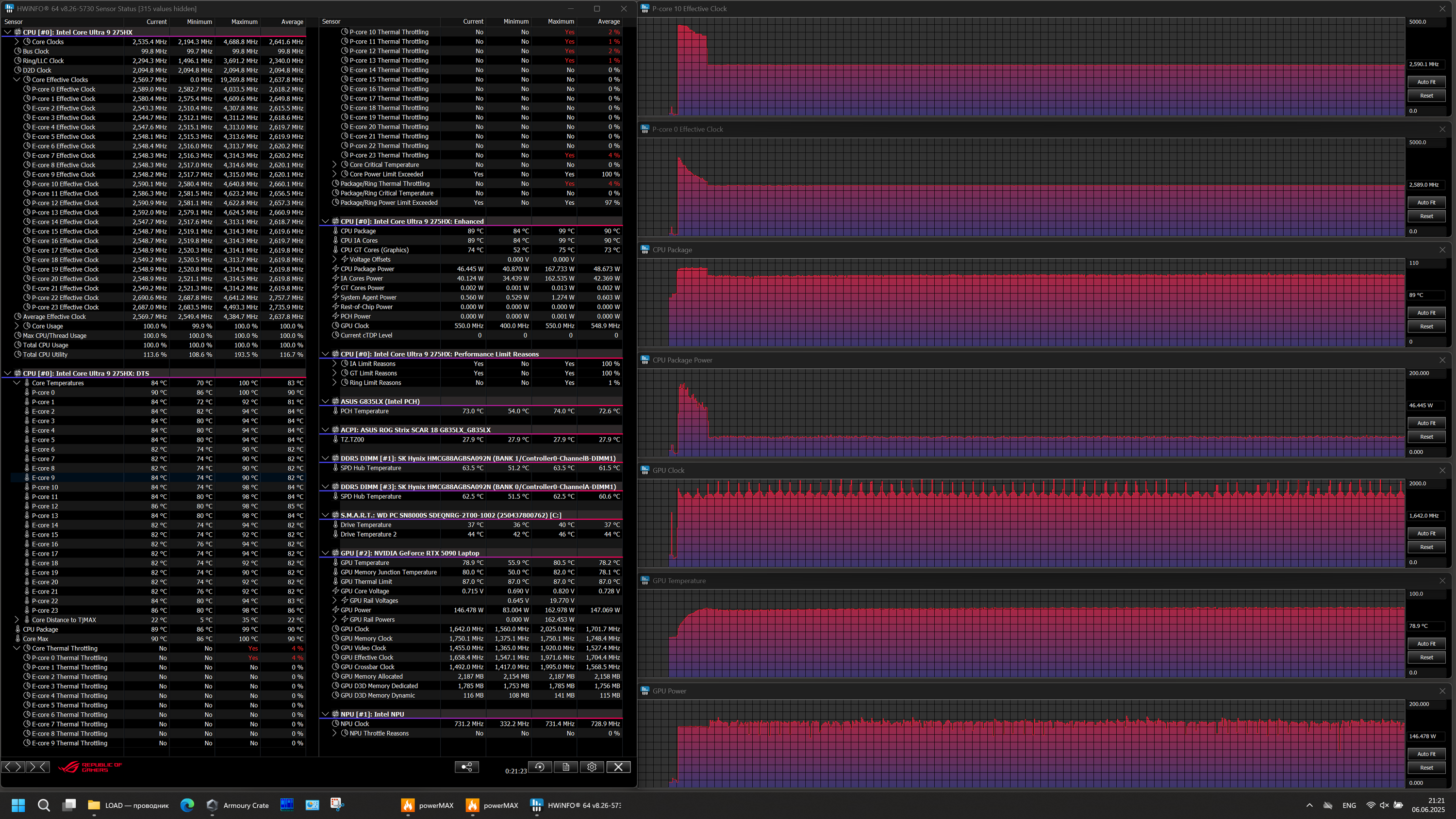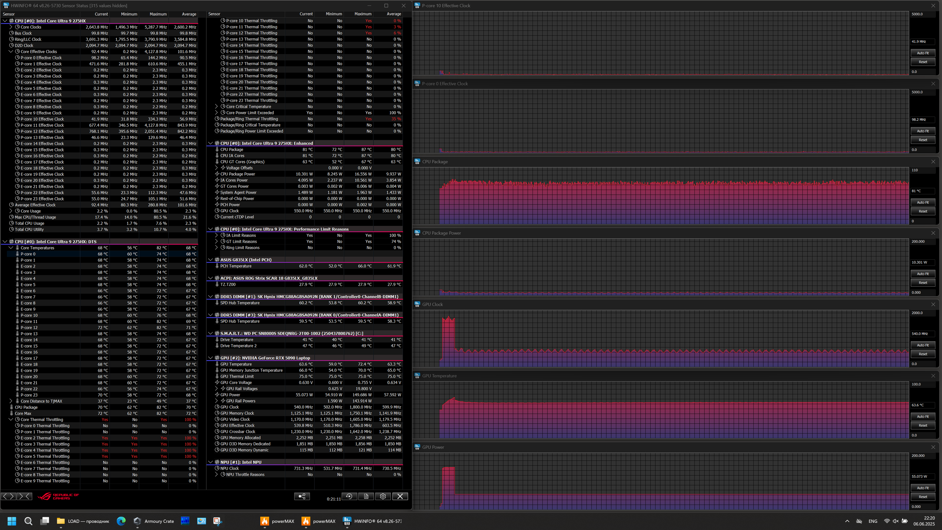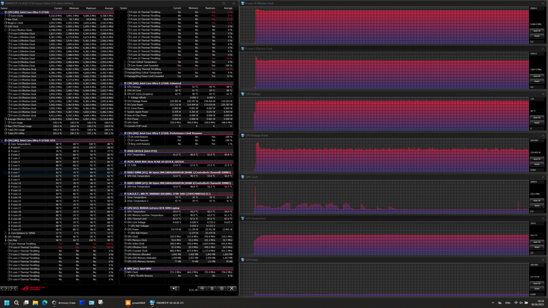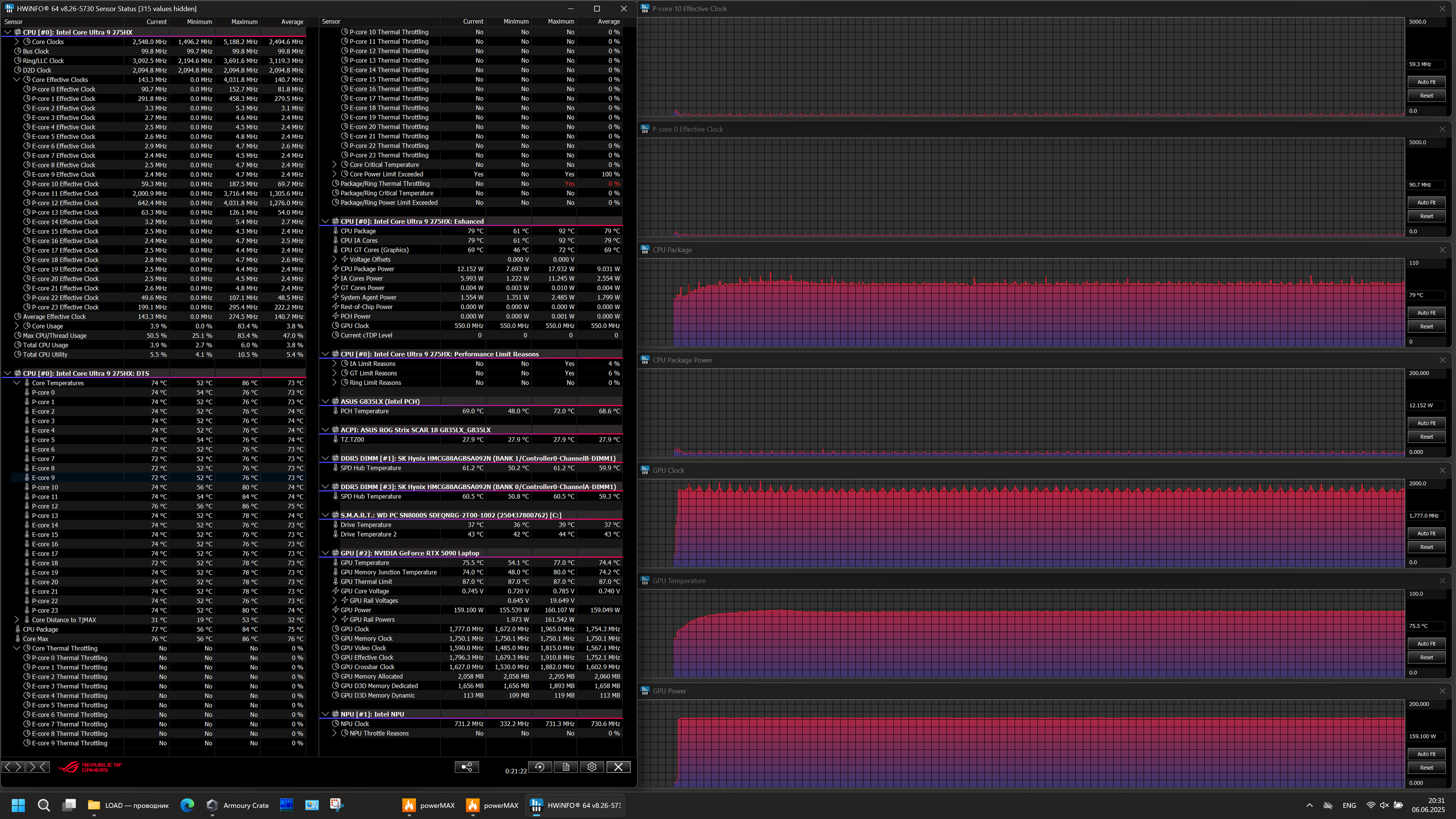 | Процессор | Intel Core Ultra 9 275HX: 8 P-ядер/8 потоков, 2,7 ГГц (Turbo 5,4 ГГц), 16 E-ядер/16 потоков; 2,1 ГГц (Turbo 4,6 ГГц); TDP 45—55 Вт (Turbo 160 Вт), Tjmax — 105 °C | |