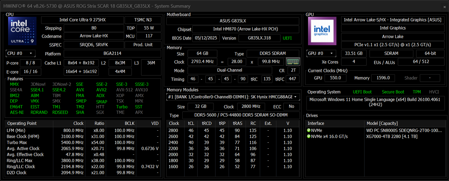 В интернет-каталоге производителя представлено три модификации системы, которые внешне неотличимы друг от друга. Все они комплектуются экранами ROG Nebula HDR 18 дюймов, процессорами Intel Core Ultra 9 275HX, оперативной памятью объемом 64 ГБ (DDR5-5600), системными накопителями WD 2 ТБ. Различия состоят в единственной, но весьма существенной детали — варианте дискретной графики: Nvidia GeForce RTX 5090 Laptop с 24 ГБ GDDR7, Nvidia GeForce RTX 5080 Laptop с 16 ГБ GDDR7 или Nvidia GeForce RTX 5070 Laptop с 12 ГБ GDDR7. По счастью, нам досталась наиболее продвинутая модель.