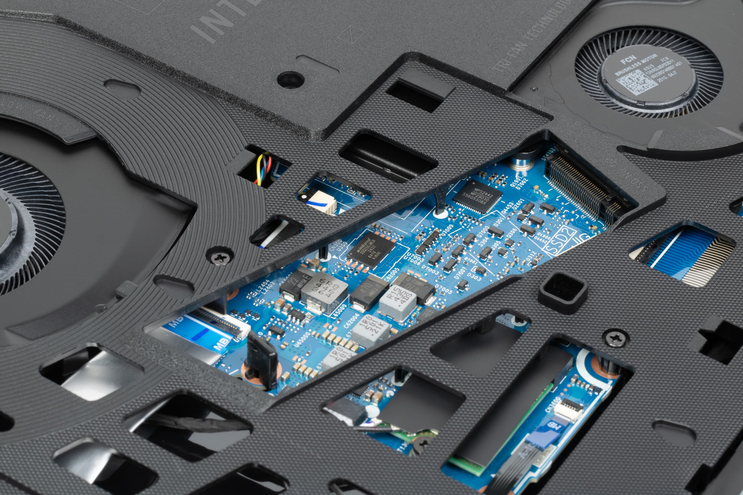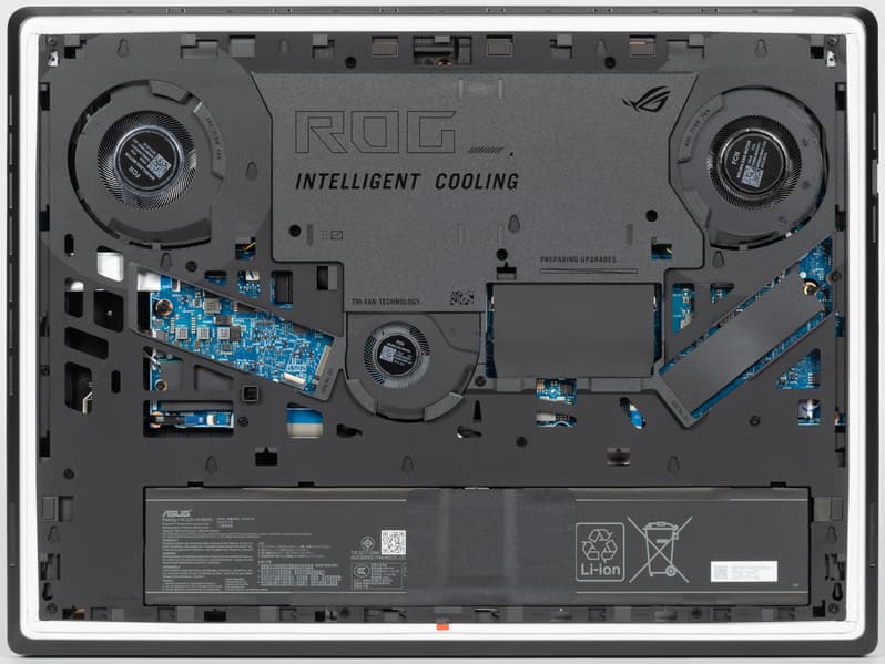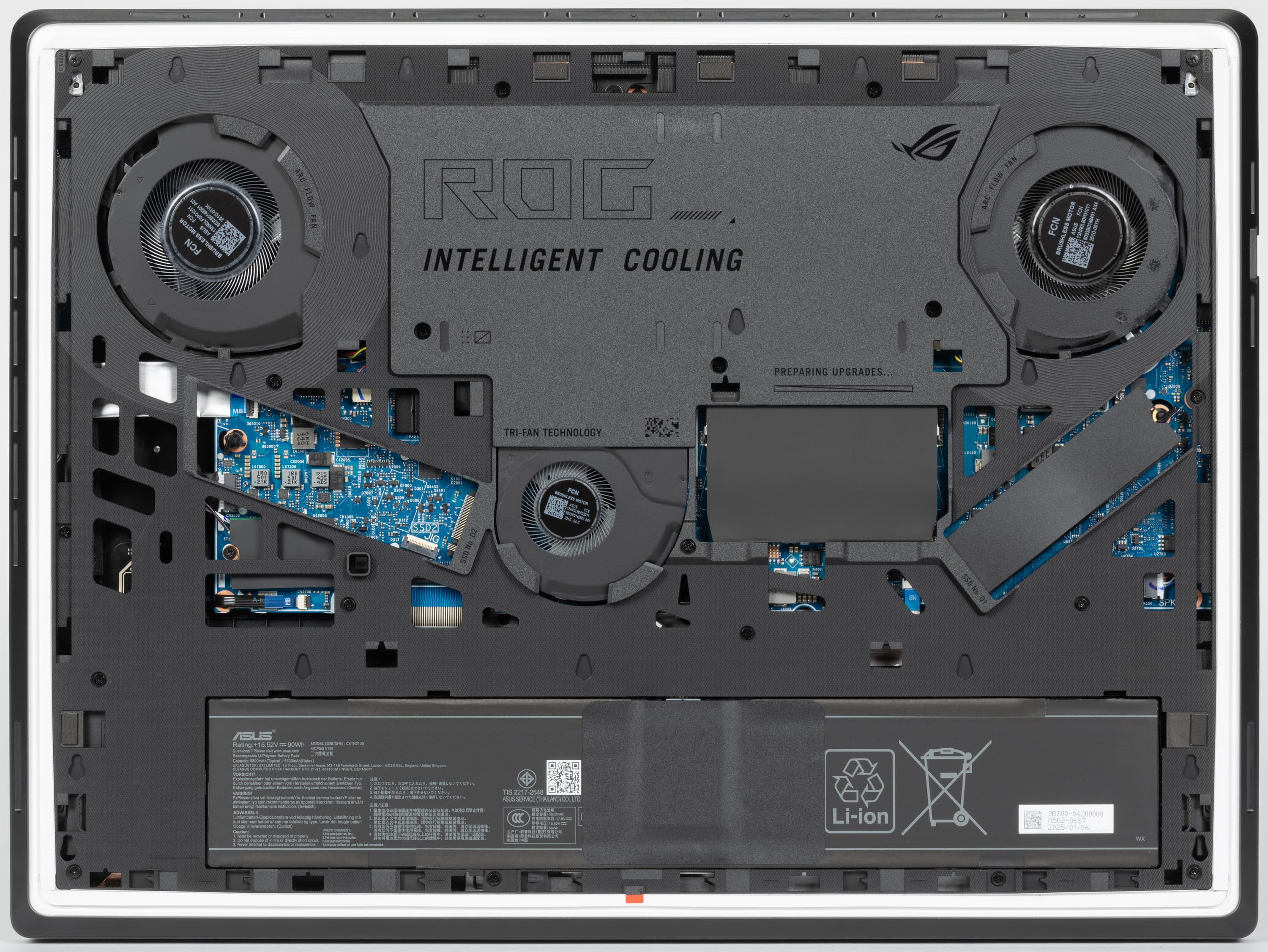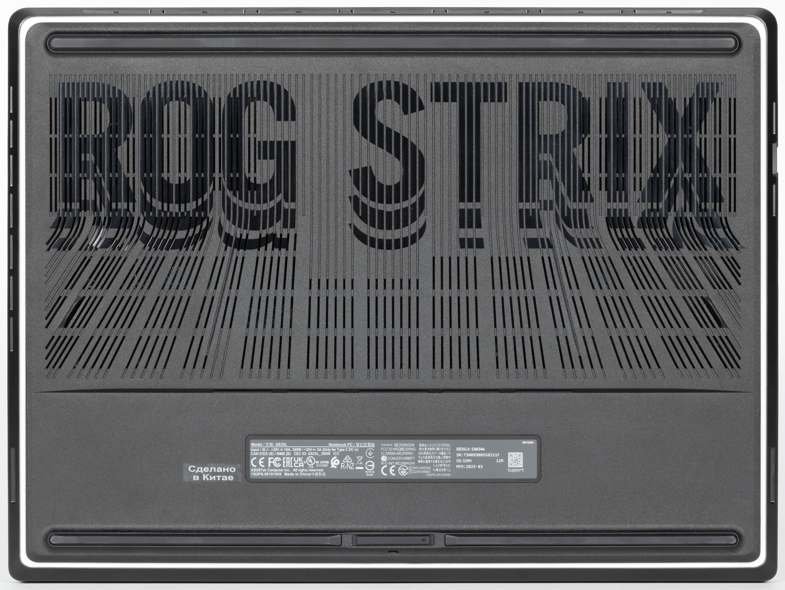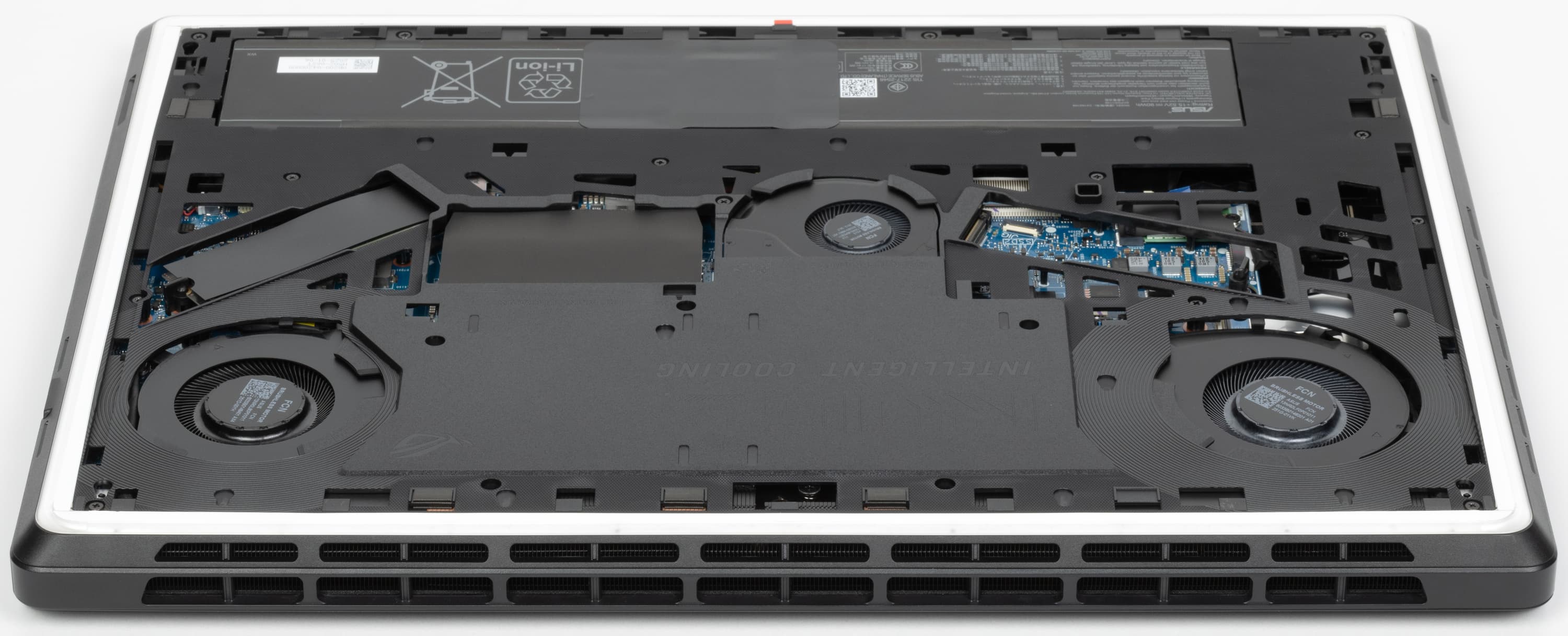 Все внутренности Asus ROG Strix Scar 18 G835LX дополнительно защищены специальной накладкой.В ней имеются прорези для кулеров CPU, GPU и «системного» (Asus Tri-Fan Technology), а также окна для доступа к аккумулятору, модулями оперативной памяти (под изолирующей шторкой), системному накопителю, второму (свободному) слоту M.2 для установки дополнительного NVMe.
