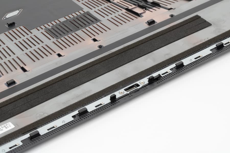 Две опоры представляют собой линейки из резины. В передней имеется вырез, внутри которого располагается — о чудо! — кнопка фиксации и освобождения крепежных элементов нижней крышки. Винтов нет ни одного, и для энтузиастов это настоящий подарок: понадобился доступ внутрь — его можно получить за секунду.
