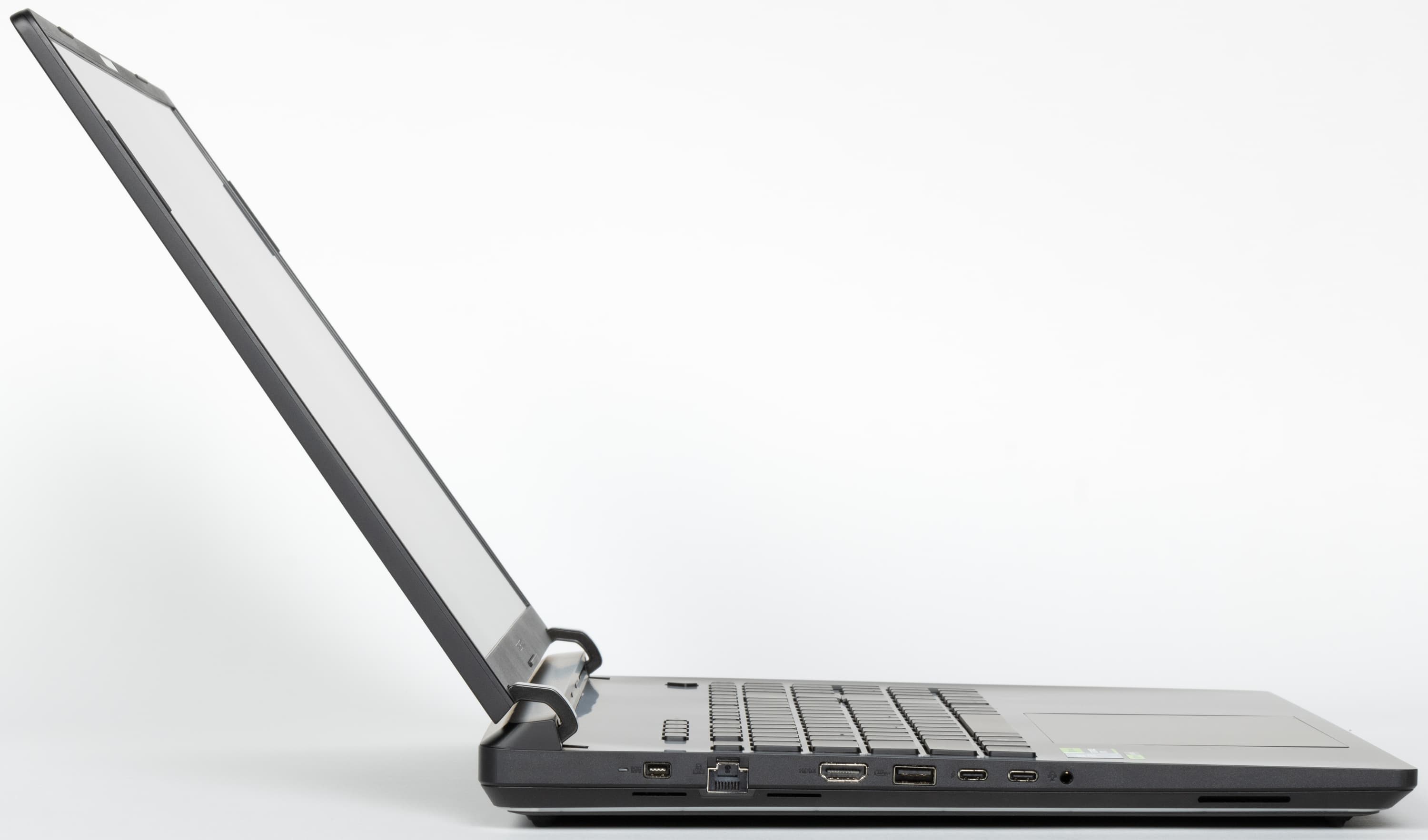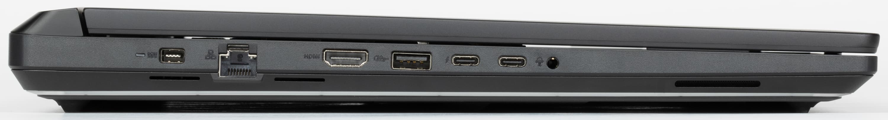 На левой боковой панели располагаются проприетарный разъем для подключения адаптера питания, сетевая розетка RJ-45, видеовыход HDMI, порт USB 3.2 Gen2 Type-А и два Thunderbolt 5, а также комбинированный миниджек для аудиогарнитуры.