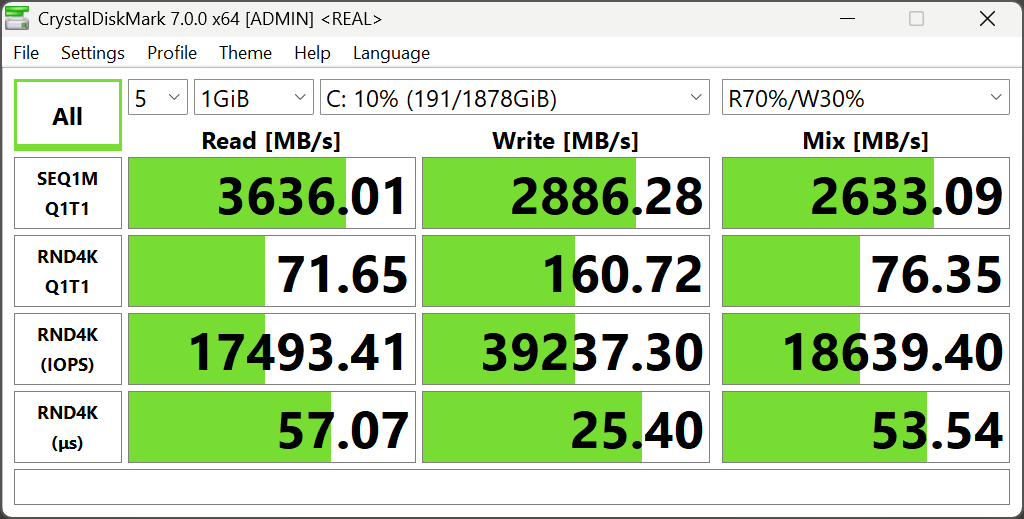 В этой серии испытаний в качестве референсной системы выступил настольный ПК, оснащенный CPU Intel Core i9-13900H, 128 ГБ оперативной памяти DDR5-5600, видеокартой Nvidia GeForce RTX 4070 с 8 ГБ GDDR6 и накопителем Kingston 7000XR вместимостью 2 ТБ (интерфейс подключения PCIe 4.0 ×4). Представляем программу с перечислением тестов по порядку их исполнения. Каждый из них выполнялся трижды, а финальный результат рассчитывался как простое арифметическое.