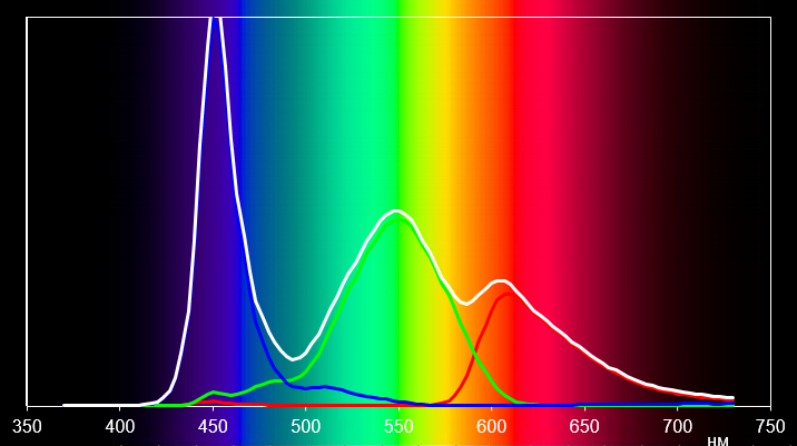 Светофильтры ЖК-матрицы неплохо выделяют спектры основных цветов. Спектры основных цветов почти не перекрываются.