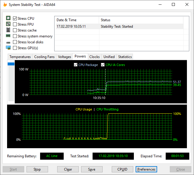 В режиме одновременной стрессовой загрузки процессора и видеокарты частота ядер процессора составляет 2,8 ГГц.