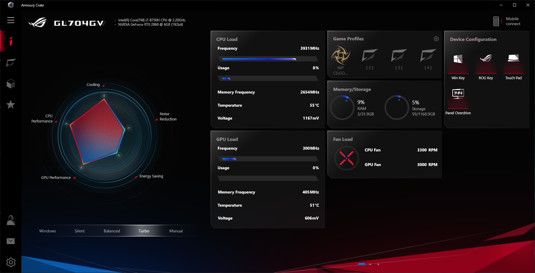 Резюмируя, можно сказать, что Asus ROG Strix Scar II GL704GV — это отличный высокопроизводительный игровой ноутбук. Из недостатков тут, пожалуй, только уровень шума под высокой нагрузкой (типичная проблема для игровых ноутбуков). Зато: «камуфляжный» дизайн, стильная RGB-подсветка клавиатуры, качественный экран с тонкими рамками, хороший звук — одним словом, достоинств у ноутбука много, и, конечно же, от такого ноутбука никто бы не отказался.