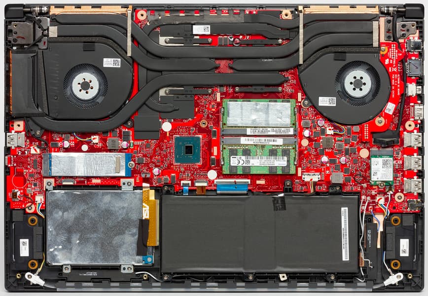 Сняв нижнюю панель корпуса Asus ROG Strix Scar II GL704GV, можно получить доступ практически ко всем компонентам ноутбука.