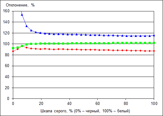 Стабильность цветовой температуры объясняется тем, что основные цвета стабильны по всей шкале серого. Однако стоит отметить, что уровень красного немного занижен, а синего, наоборот, завышен.