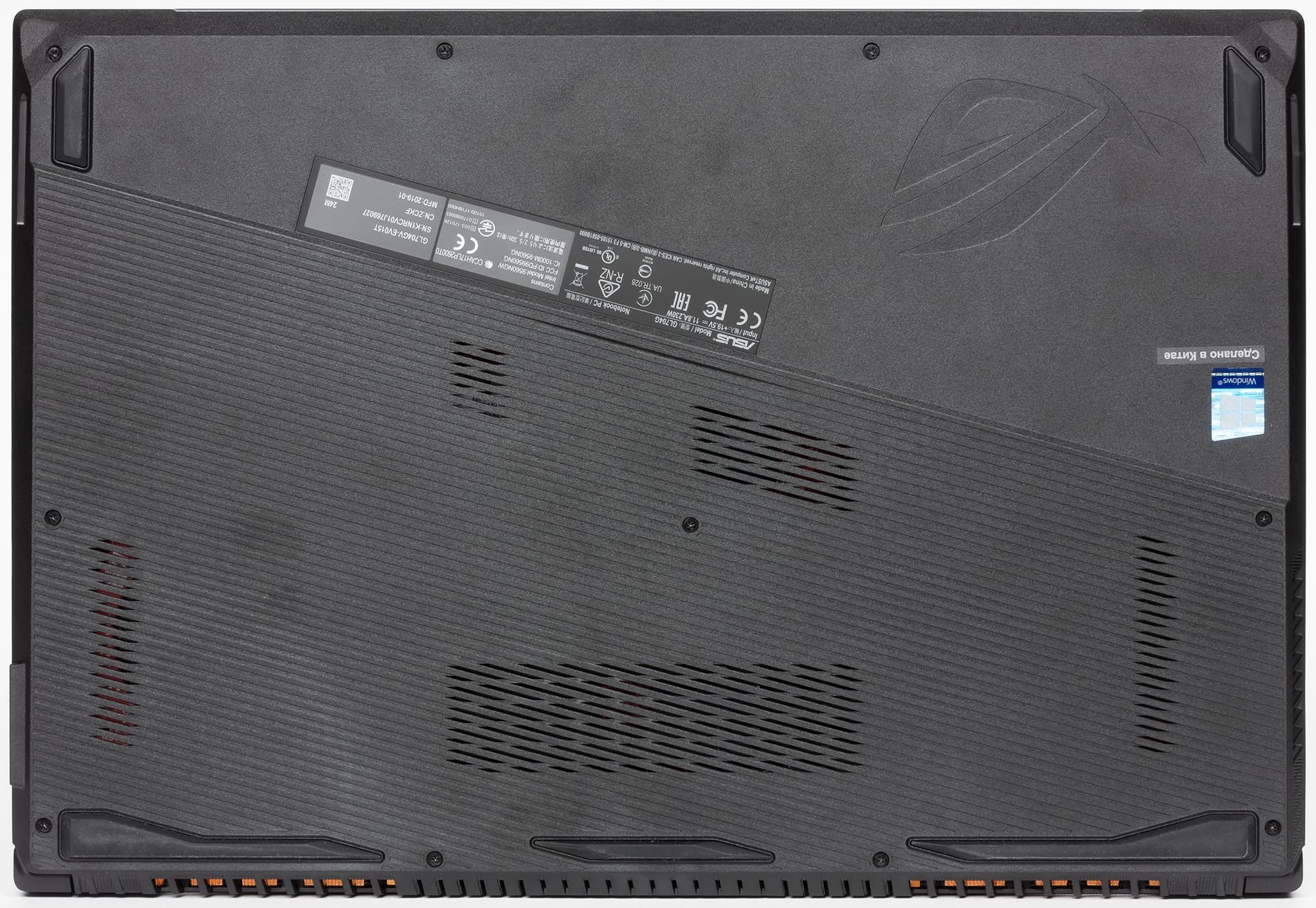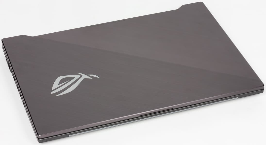 Корпус ноутбука выполнен из пластика темно серого цвета. На крышке сверху красуется зеркальная эмблема игровой серии Asus ROG, которая подсвечивается красным цветом при включении ноутбука. Крышка однотонная, но диагональю она делится на две части, обе части текстурированы под шлифованный металл, но шлифовки разные.