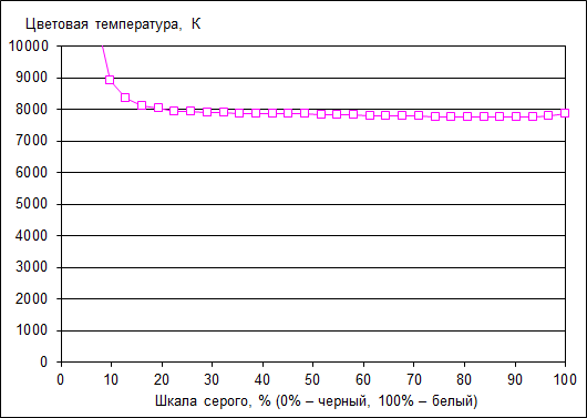 Цветовая температура ЖК-экрана стабильна по всей шкале серого и составляет примерно 8000 K.