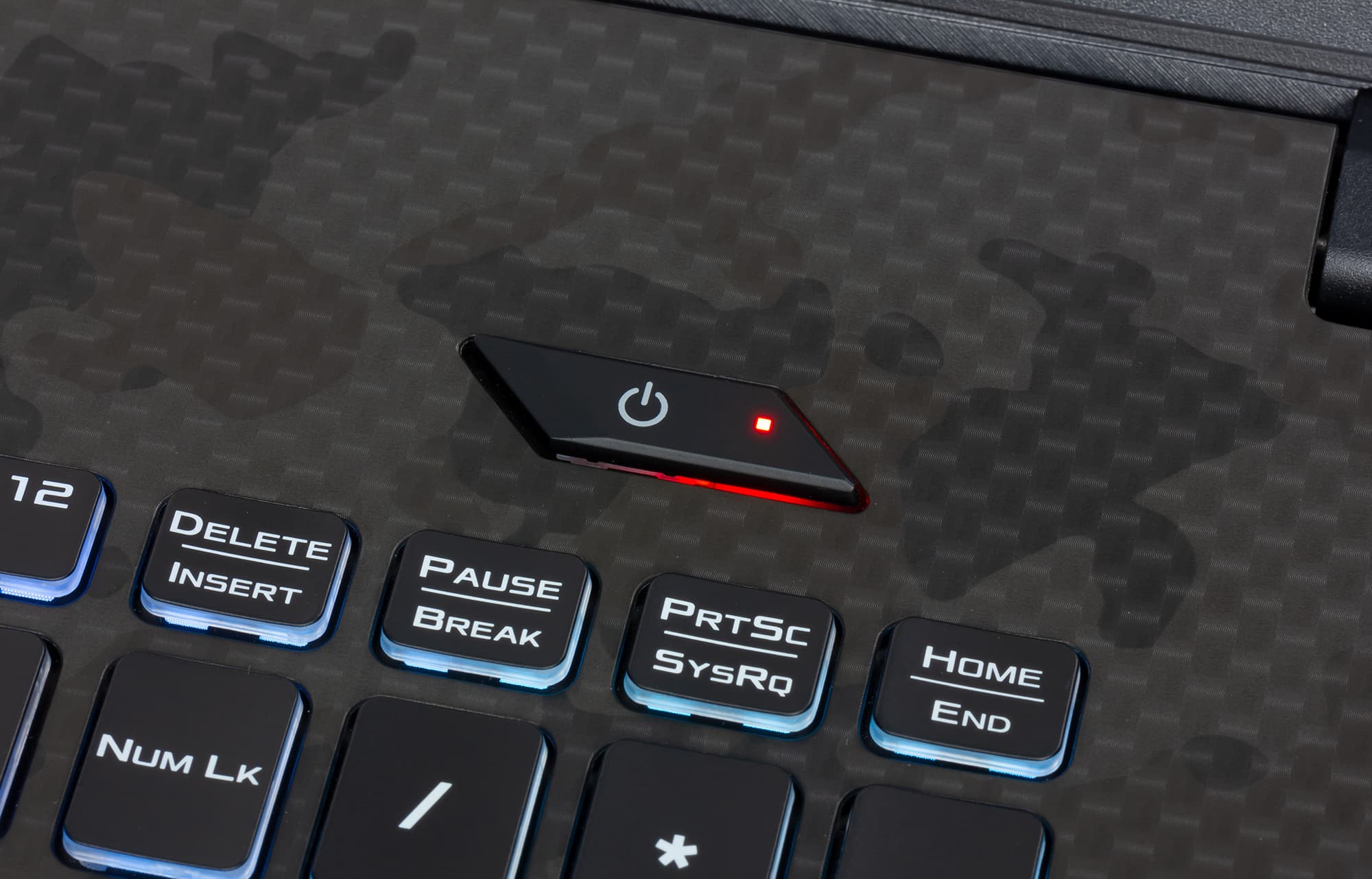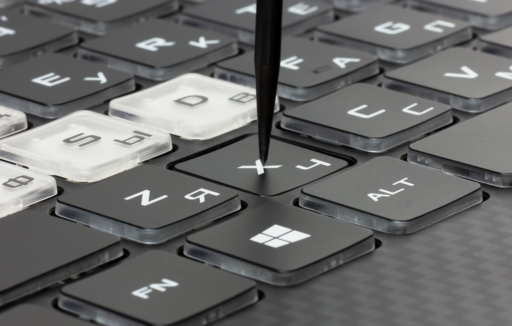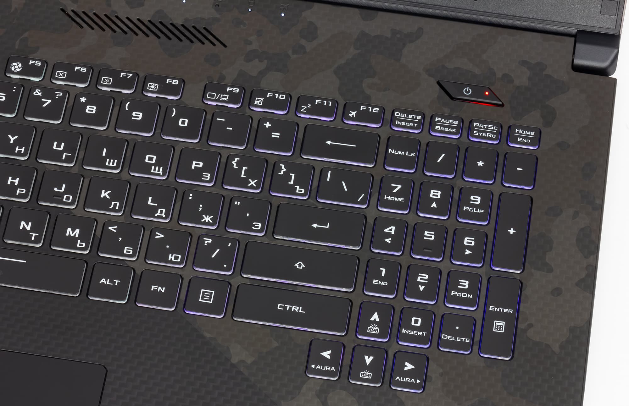 Поскольку данный ноутбук ориентирован на игры, здесь выделена зона игровых клавиш WASD: у этих клавиш полупрозрачные колпачки, а основание — белого цвета (соответственно, символы на этих клавишах темные).