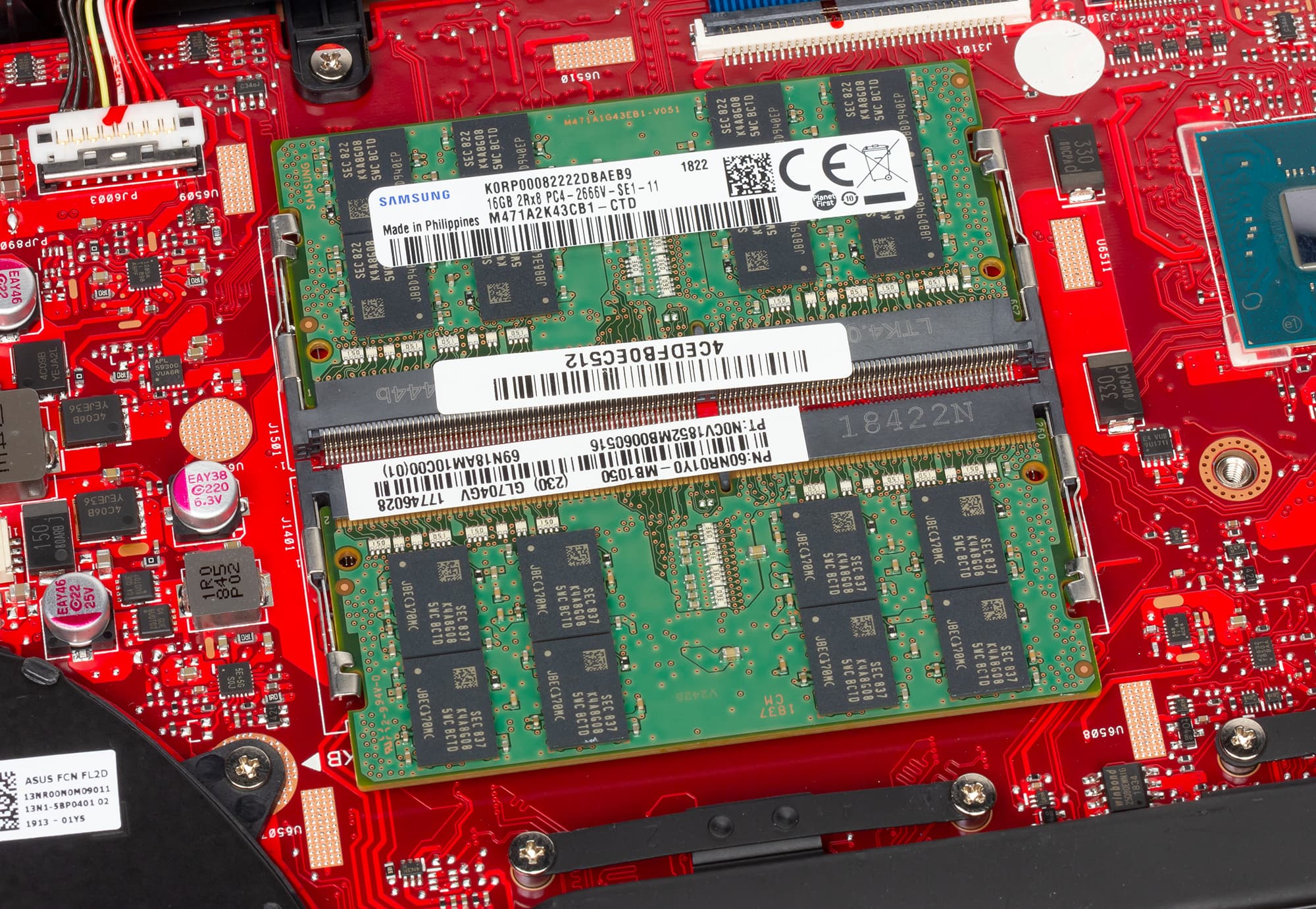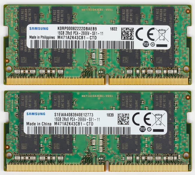 В нашем случае в ноутбуке было установлено два модуля памяти DDR4-2666 емкостью по 16 ГБ (Samsung M471A2K43CB1-CTD). Максимальный объем памяти, поддерживаемый ноутбуком, составляет как раз 32 ГБ.