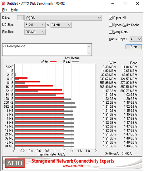 Утилита ATTO Disk Benchmark определяет его максимальную скорость последовательного чтения на уровне 1,5 ГБ/с, а скорость последовательной записи — на уровне 1,2 ГБ/с.