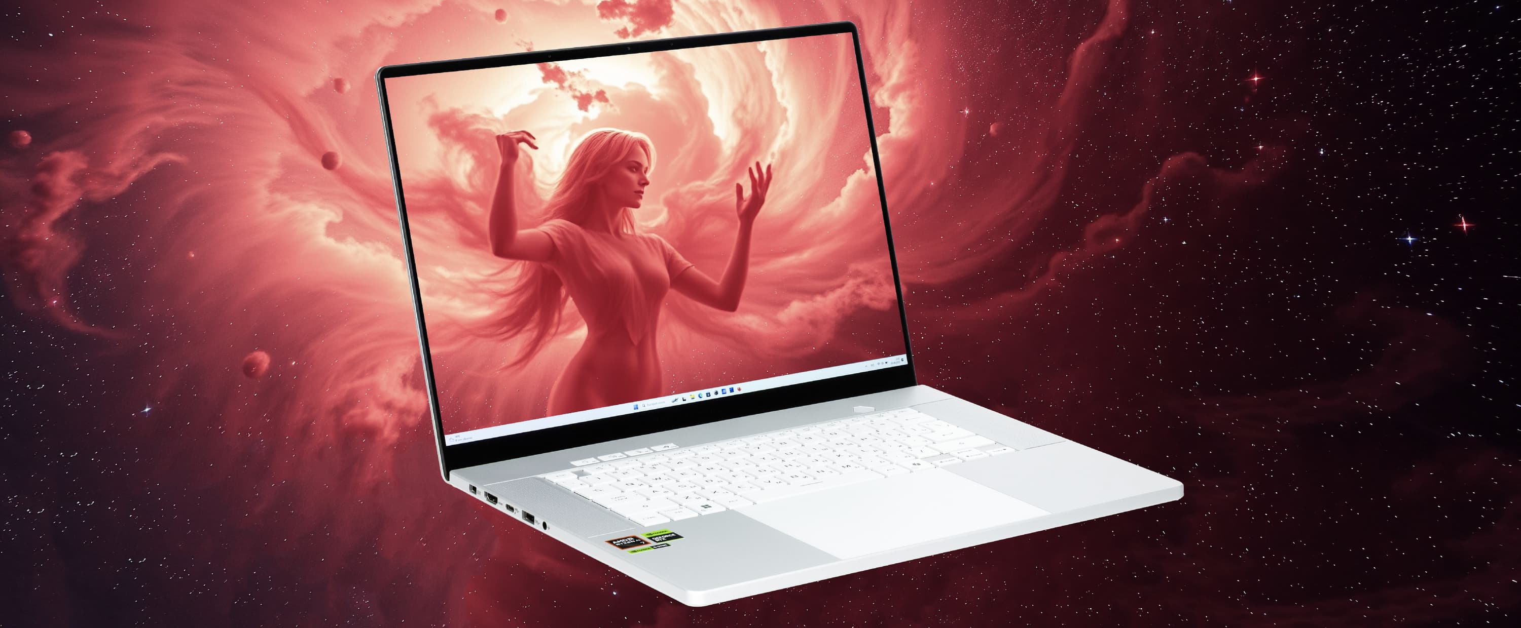 Новинка с отличным дизайном в светлых тонах привлекательна еще и тем, что заключена в цельнометаллический корпус и экипирована экраном OLED 2.5K с соотношением сторон 16:10, который поддерживает 10-битный вывод изображения и обладает сертификацией VESA Display HDR True Black 500. Начинка отражает точку зрения производителя на то, чего достаточно для креативной деятельности и игр: AMD Ryzen AI 7 350, Nvidia GeForce RTX 5060 Laptop, 32 ГБ оперативной памяти, не подлежащей замене и апгрейду, всего один высокоскоростной порт USB 4. Зато второй Type-С (как и USB 4) поддерживает вывод видео и питание внешних устройств, поэтому с учетом наличия отдельного HDMI к ноутбуку можно подключить до трех внешних мониторов одновременно. Имеется картовод для SD. Клавиатура неплохая, но лишена цифрового блока. Нет встроенного адаптера локальной сети. Веб-камера в рамке экрана обладает разрешением 1080p и лишена механической шторки. Автономность машины существенно выше того, чего можно ожидать от настоящих игровых ноутбуков — почти 11 часов работы от батареи при наборе текста и без малого 9 часов при просмотре видео. В тестах реальных приложений мы подтвердили способность устройства справиться даже со сложными и ресурсоемкими приложениями, в том числе для работы с медиаконтентом. Нативное разрешение экрана (2.5K) дает возможность играть в современные динамичные игры.