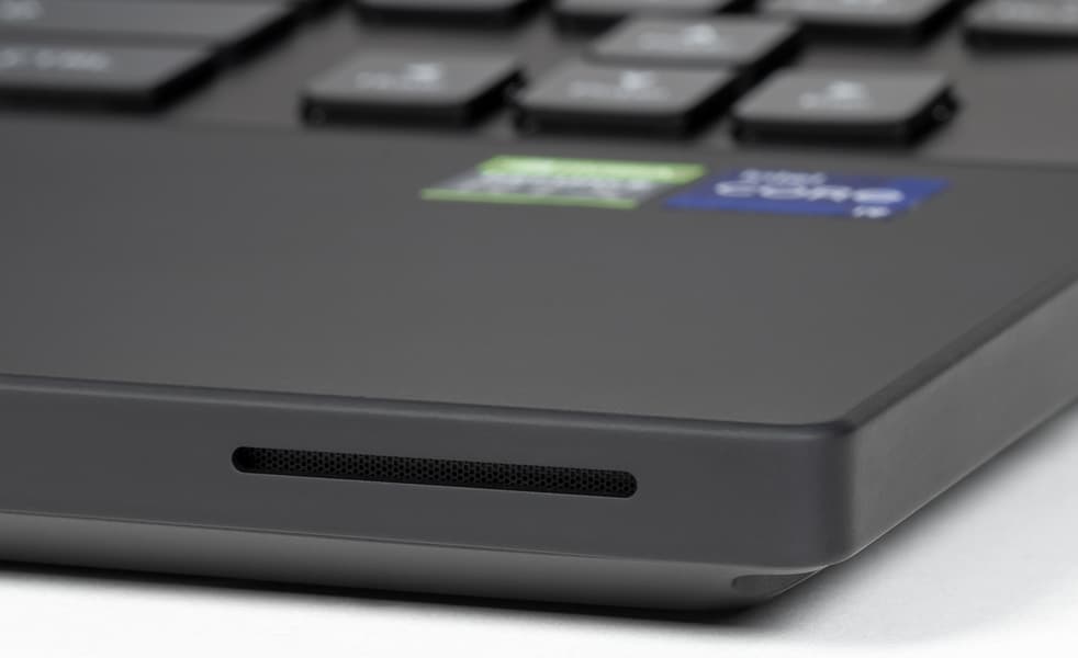 Что еще можно заметить по раскладке? В основной части она, в принципе, стандартная в хорошем смысле: всё на своих местах, кнопки достаточно большие (15,5×15,5 мм, 4 мм между краями), Ё не заужена, в верхнем ряду кнопки полноразмерные, а не ужатые по высоте, и разбитые на четверки. В нижнем ряду всего одна кнопка Win, зато две Fn (удобно брать аккорды) и есть кнопка ROG для запуска фирменной утилиты Armoury Crate. Кнопка питания вынесена за пределы клавиатуры, имеет нестандартную форму и выполнена заподлицо с рабочей поверхностью, так что случайные нажатия практически исключены. В нее интегрирован сканер отпечатков пальцев, в том числе позволяющий одним касанием вернуться к работе с ноутбуком после открытия крышки.