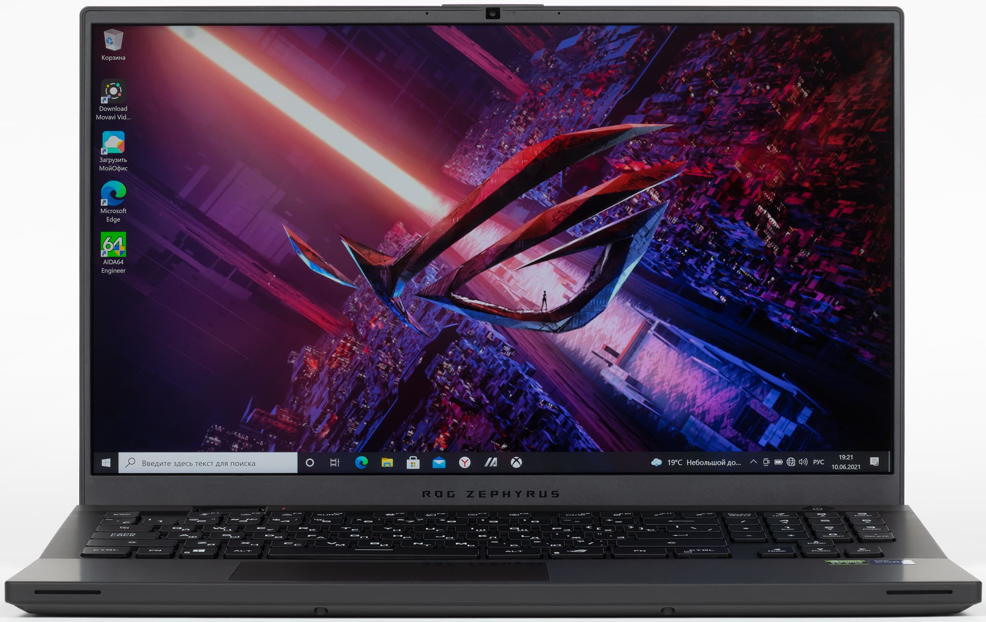 Тестирование ноутбука в играх мы проведем с использованием его дискретной видеокарты Nvidia GeForce RTX 3080 Laptop. Напомним, что мобильные видеокарты линейки GeForce RTX 30, основанные на архитектуре Ampere, были анонсированы в начале 2021 года. Nvidia заявляет для этих моделей только диапазон возможных рабочих характеристик, а параметры работы видеокарты в конкретном ноутбуке определяются его создателем. Так, на сайте Nvidia для GeForce RTX 3080 Laptop заявлены Boost-частоты от 1245 до 1710 МГц и потребление 80—150 Вт (и более). Asus на своем сайте приводит цифры 1645 МГц и 125 Вт (с динамическим разгоном до 140 Вт) — традиционно, мы под нагрузкой наблюдали именно такое потребление, а вот подобная частота была достижима лишь в редких пиках (подробнее см. в разделе тестирования под нагрузкой). Также у карты 16 ГБ памяти GDDR6 с 256-битной шиной — это максимальный возможный объем на сегодняшний день. В общем, безусловно топовое решение.