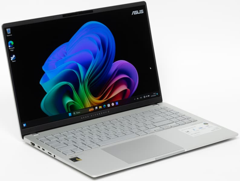 На русскоязычном сайте производителя новый ИИ-герой семейства Asus Vivobook S 15 представлен в двух модификациях, различающихся моделями платформы Qualcomm Snapdragon: с 8-ядерной X Plus X1P-42-100 (30 МБ кеш-памяти) либо с 12-ядерной X Elite X1E-78-100 (42 МБ кеш-памяти). Рабочая тактовая частота у обеих моделей одинаковая (3,4 ГГц); оба варианта экипированы видеоускорителями Qualcomm Adreno 311 и нейронными вычислительными блоками Qualcomm Hexagon NPU (производительность до 45 TOPS). Другие различия касаются доступных объемов оперативной памяти (16 или 32 ГБ) и вместимости системного накопителя (512 ГБ или 1 ТБ). Для проведения испытаний мы получили наиболее продвинутый вариант Asus Vivobook S 15 S5507QAD.