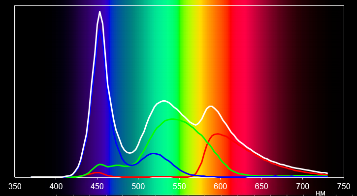 Светофильтры ЖК-матрицы не очень хорошо выделяют основные цвета. Спектры красного и зеленого, а также синего и зеленого цветов сильно перекрываются, а сам спектр заужен.