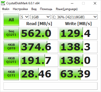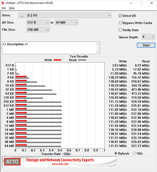 Утилита ATTO Disk Benchmark определяет максимальную скорость последовательного чтения этого накопителя на уровне 530 МБ/с, а последовательной записи — на уровне 130 МБ/с.