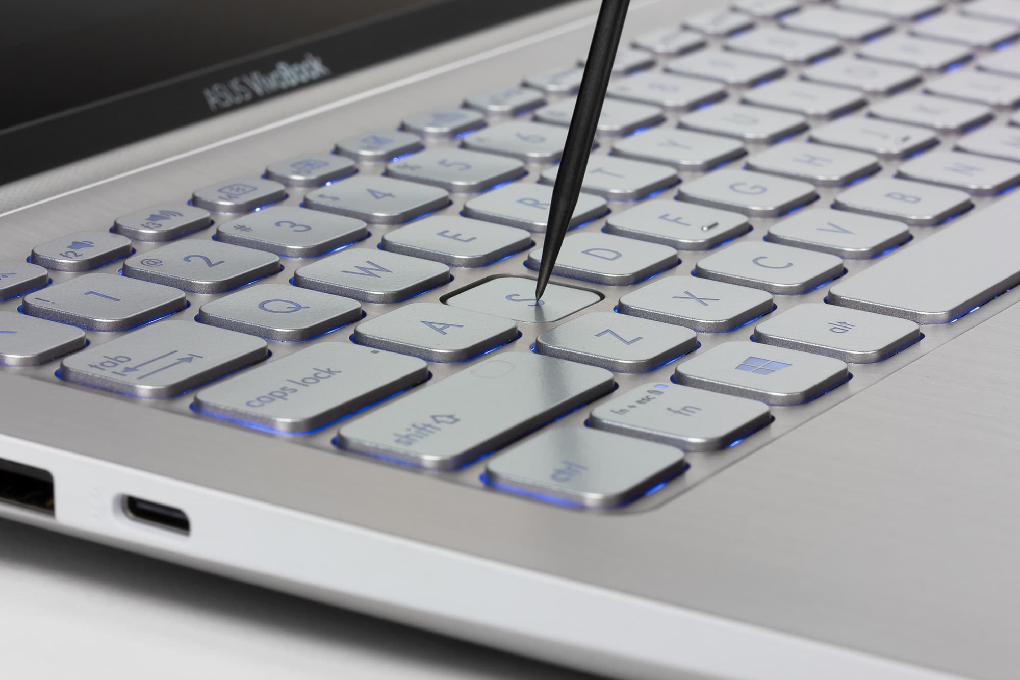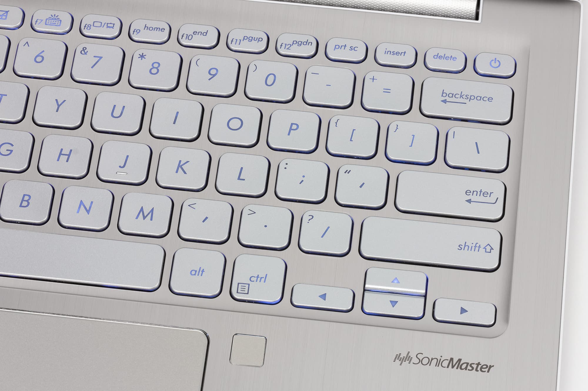 В клавиатуре предусмотрена трехуровневая подсветка. Клавиши клавиатуры — такого же цвета, как и корпус (серебристые в нашем случае), а символы на клавишах — бледно-белого цвета.