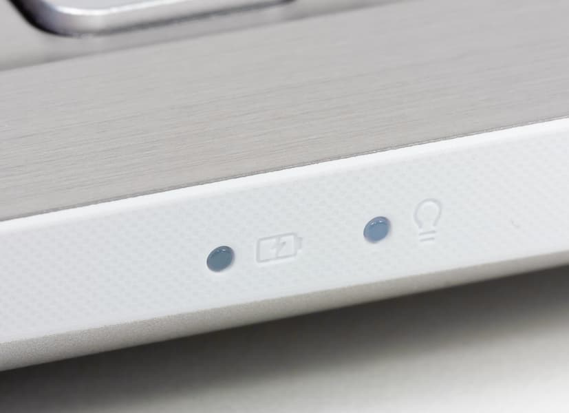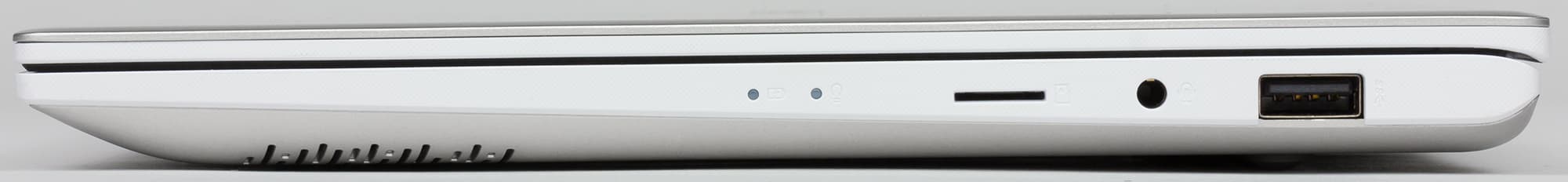 Светодиодных индикаторов состояния в этом ноутбуке всего два (индикатор заряда батареи и индикатор питания), и расположены они на боковом торце корпуса. Индикаторы очень маленькие и едва заметны.