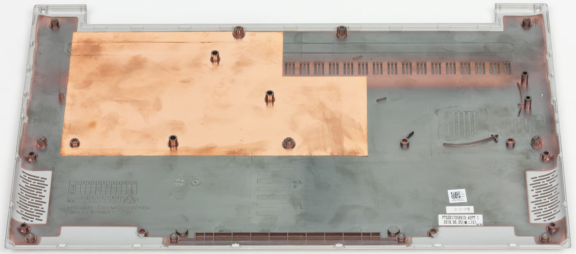 На нижней панели ноутбука имеются резиновые ножки, вентиляционные отверстия и сетки, закрывающие динамики.