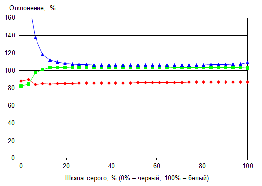 Стабильность цветовой температуры объясняется тем, что основные цвета очень хорошо сбалансированы по всей шкале серого.