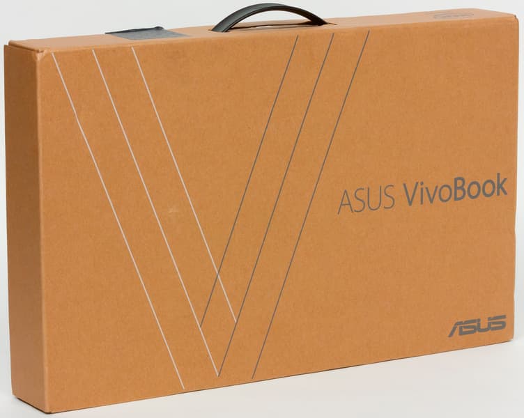 Ноутбук запечатан в компактную картонную коробку, оснащенную пластиковой ручкой для переноски. Информации на коробке — самый минимум, есть только название серии и маркировка модели с серийным номером на небольшой наклейке.