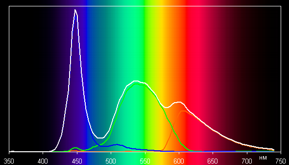 Поэтому визуально цвета имеют естественную насыщенность. Ниже приведен спектр для белого поля (белая линия), наложенный на спектры красного, зеленого и синего полей (линии соответствующих цветов):