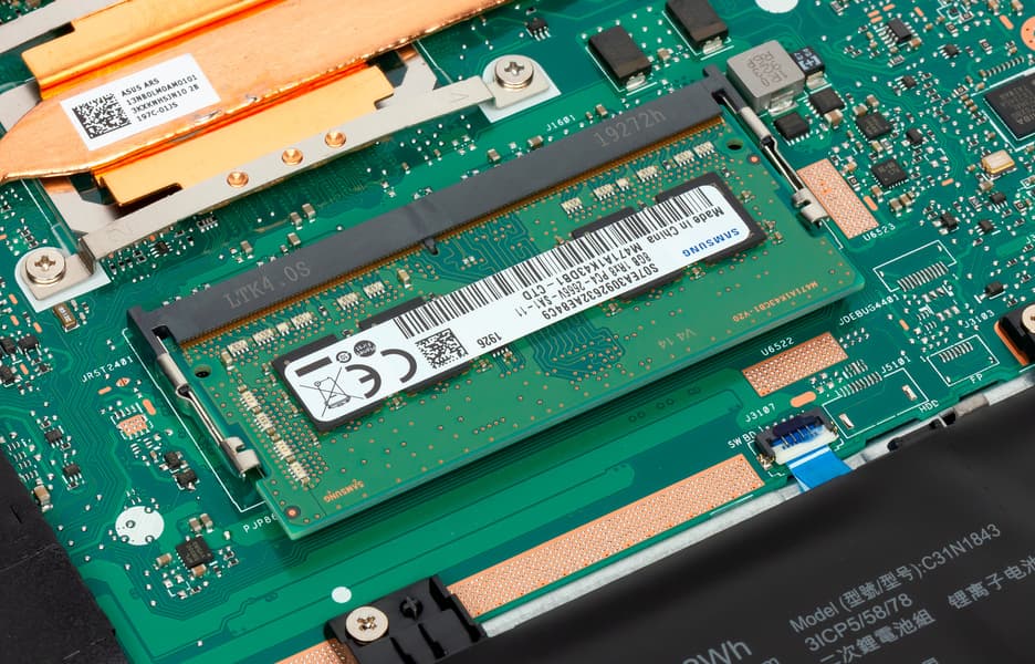 Аппаратная компоновка Asus VivoBook S532F разительно отличается от компоновки ZenBook 14 UX434F. Здесь иначе сориентирована сама материнская плата, процессор с системой охлаждения, память и накопители. Только аккумулятор установлен в привычном месте ближе к переднему краю.