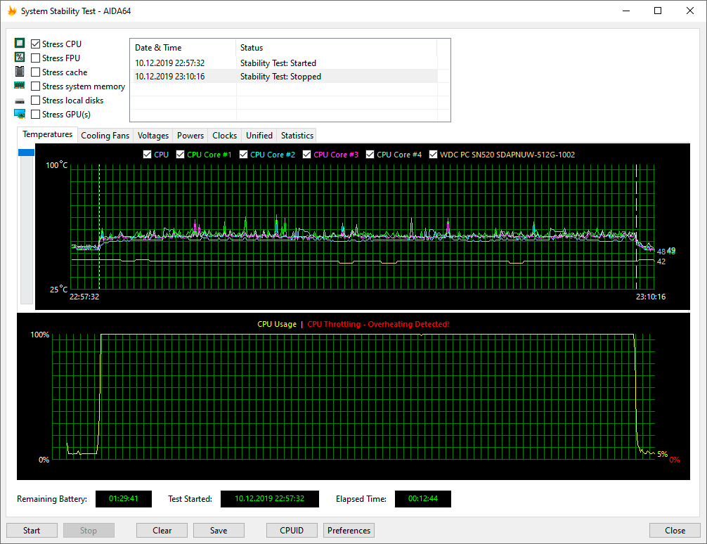 Тесты Asus VivoBook S532F мы проводили в тех же условиях, что и ZenBook 14 UX434F. Для создания нагрузки был использован стресс-тест CPU из последней версии утилиты AIDA64 Extreme. Все тесты проводились под управлением операционной системы Windows 10 Pro x64 с установкой последних доступных драйверов и обновлений. Температура в помещении во время тестирования составляла 24,5-25 °C.
