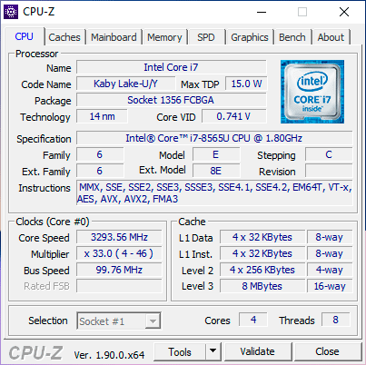 Центральным процессором здесь выступает 14-нанометровый Intel Core i7-8565U с четырьмя ядрами и поддержкой Hyper-Threading. Он работает в частотном диапазоне от 1,8 до 4,6 ГГц при пиковом уровне энергопотребления 25 ватт (15 ватт — типичное значение TDP).