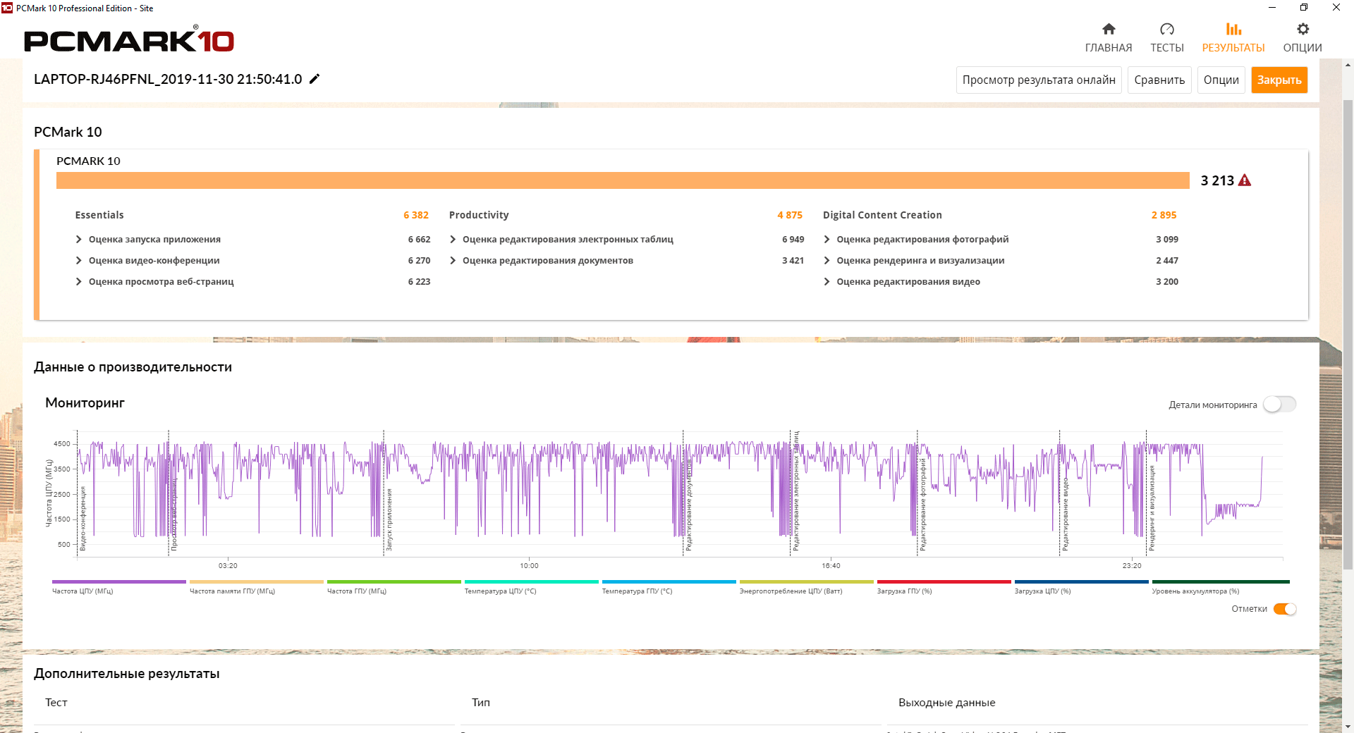 Максимальная частота процессора кратковременно достигала 4,0 ГГц, но львиную долю времени теста держалась у отметки 1,4 ГГц. Максимальный уровень потребления не превысил 17 ватт, а под нагрузкой колебался у 8 Вт.