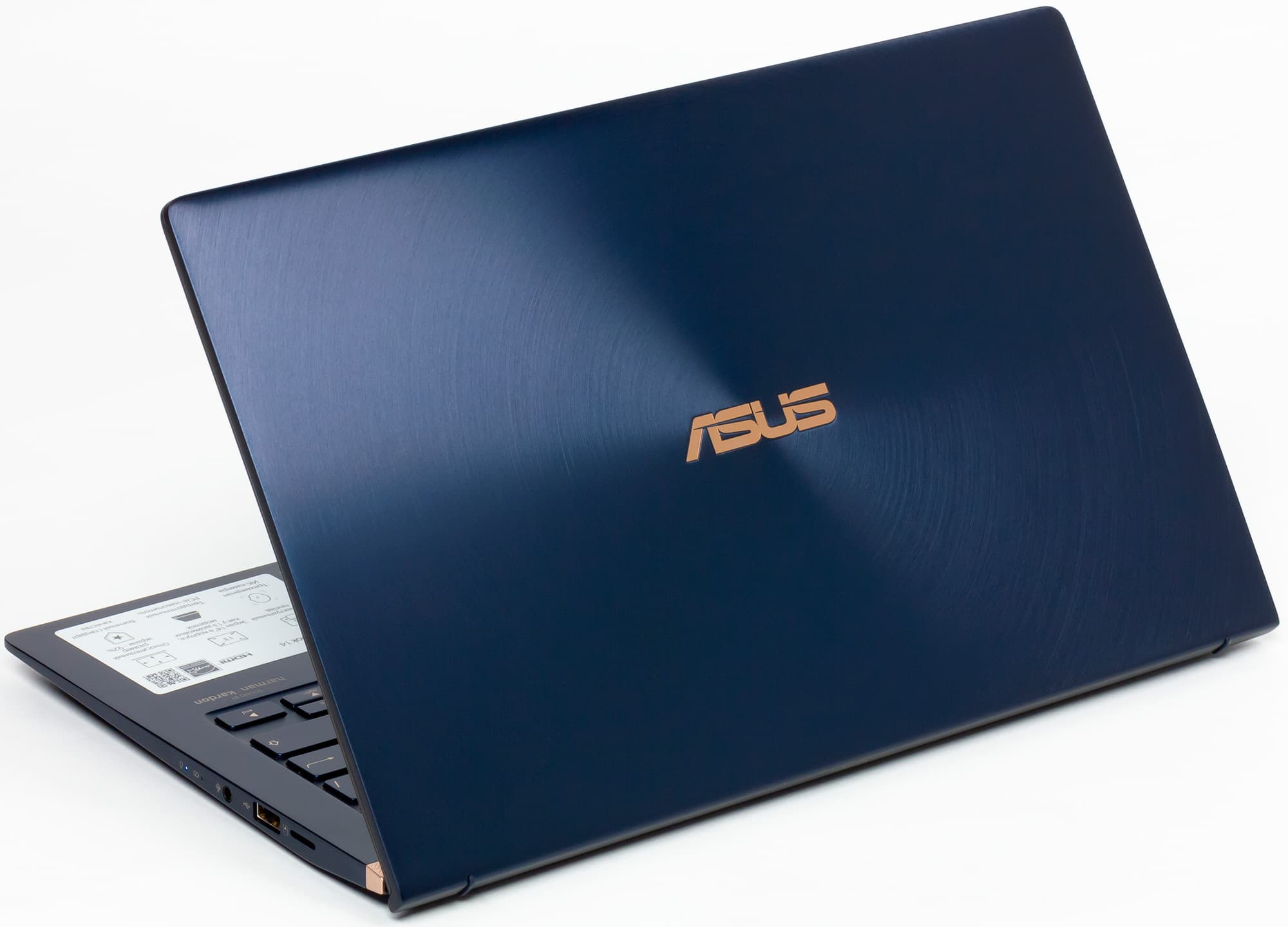 Верхняя крышка имеет концентрическую шлифовку и золотистый логотип Asus в центре, подчеркивающий роскошность и одновременно элегантность ультрабука.