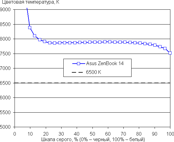 Подведем итоги. Основной экран ноутбука Asus ZenBook 14 достаточно яркий, поэтому ноутбуком как-то можно будет пользоваться ясным днем на улице, если уйти в тень. Экран-тачпад заметно ярче. В полной темноте яркость обоих экранов можно понизить до комфортного уровня, но делать это придется вручную и для каждого экрана отдельно. Цветовой баланс у обоих экранов приемлемый, контрастность высокая, но равномерность черного у основного экрана средняя. Мерцания нет ни у того, ни у другого, углы обзора хорошие. К недостаткам обоих экранов можно отнести низкую стабильность черного к отклонению взгляда от перпендикуляра к плоскости экрана.