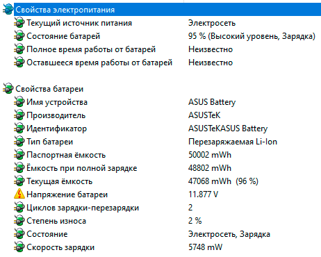 С уровня заряда 5% до 99% он заряжает встроенный в Asus ZenBook 14 UX434F литий-полимерный аккумулятор емкостью 50 Вт·ч (4335 мА·ч) за 1 час и 23 минуты.