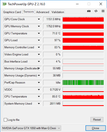 Базовая частота графического процессора Nvidia GeForce GTX 1050 (GP107) составляет 1000 МГц, а в режиме GPU Boost может достигать 1139 МГц. Как выяснилось в ходе тестирования, в режиме стрессовой загрузки (FurMark) видеокарты Nvidia GeForce GTX 1050 в установившемся режиме частота GPU составляет 1151 МГц, а частота памяти GDDR5 составляет 1752 МГц (эффективная частота 7 ГГц).